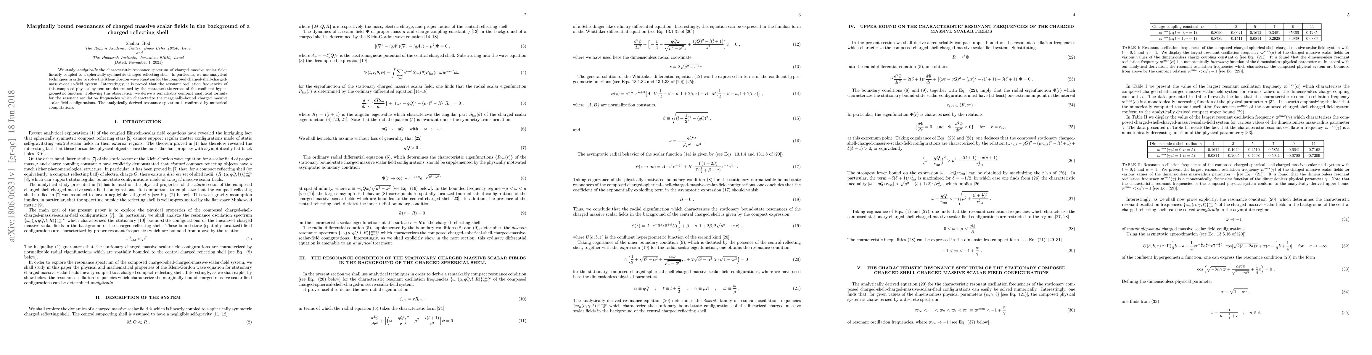 We study {\it analytically} the characteristic resonance spectrum of charged massive scalar fields linearly coupled to a spherically symmetric charged reflecting shell. In particular, we use analytical techniques in order to solve the Klein-Gordon wave equation for the composed charged-shell-charged-massive-scalar-field system. Interestingly, it is proved that the resonant oscillation frequencies of this composed physical system are determined by the characteristic zeroes of the confluent hypergeometric function. Following this observation, we derive a remarkably compact analytical formula for the resonant oscillation frequencies which characterize the marginally-bound charged massive scalar field configurations. The analytically derived resonance spectrum is confirmed by numerical computations.