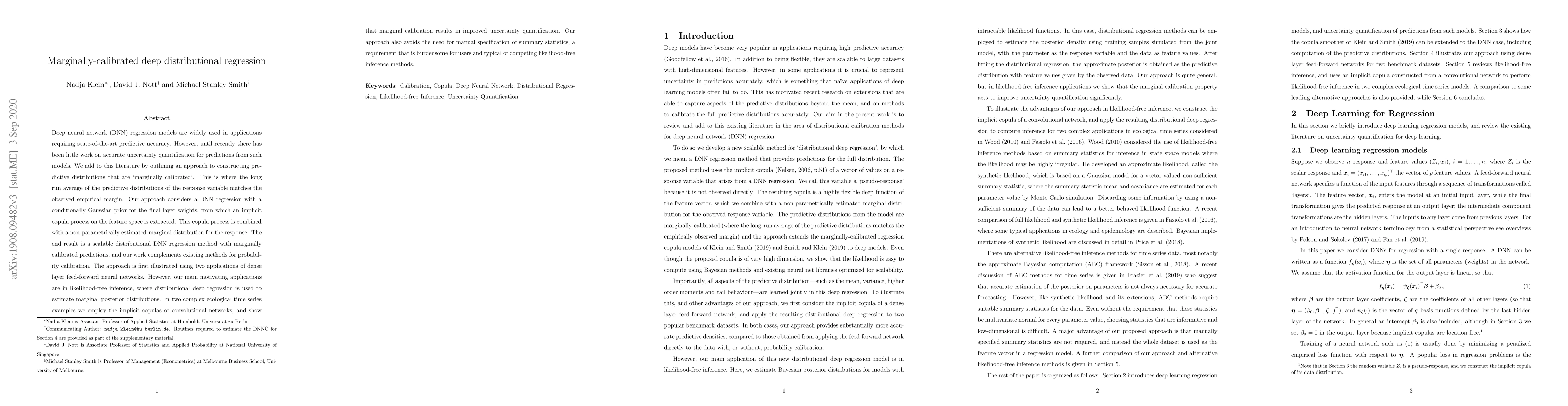This paper proposes a method for constructing marginally calibrated predictive distributions in deep neural network regression models, combining a conditionally Gaussian prior with an implicit copula process and a non-parametric marginal distribution estimate. The approach enhances uncertainty quantification in likelihood-free inference, demonstrated through improved results in ecological time series analysis.