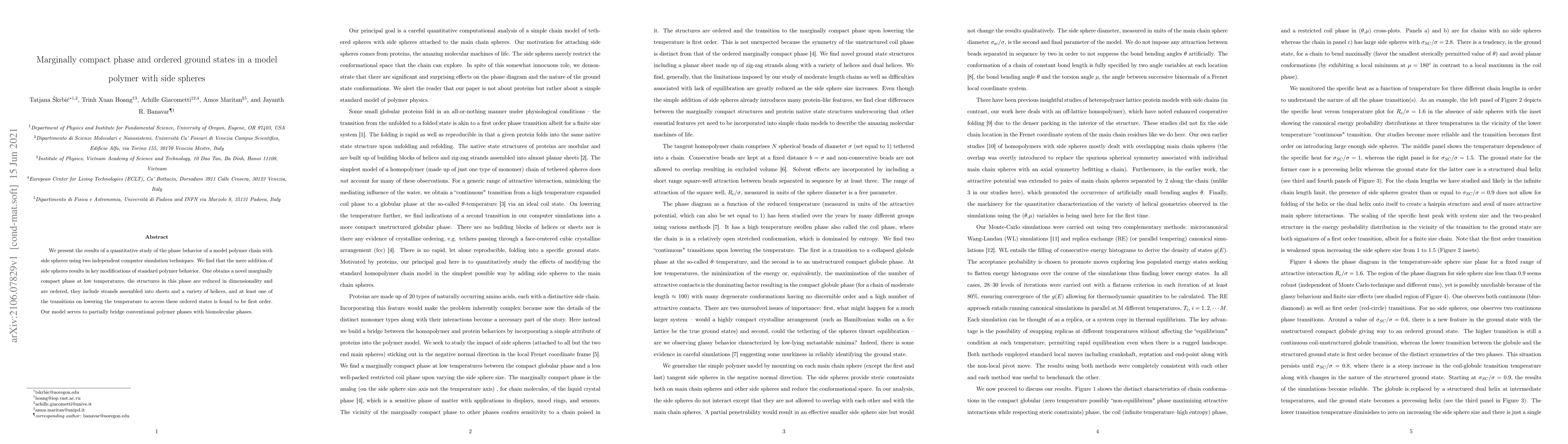 This study reveals a novel marginally compact phase in a polymer model with side spheres, characterized by reduced dimensionality and ordered structures like sheets and helices, identified through computer simulations. The transition to these ordered states is first order, bridging conventional polymer and biomolecular phases.
