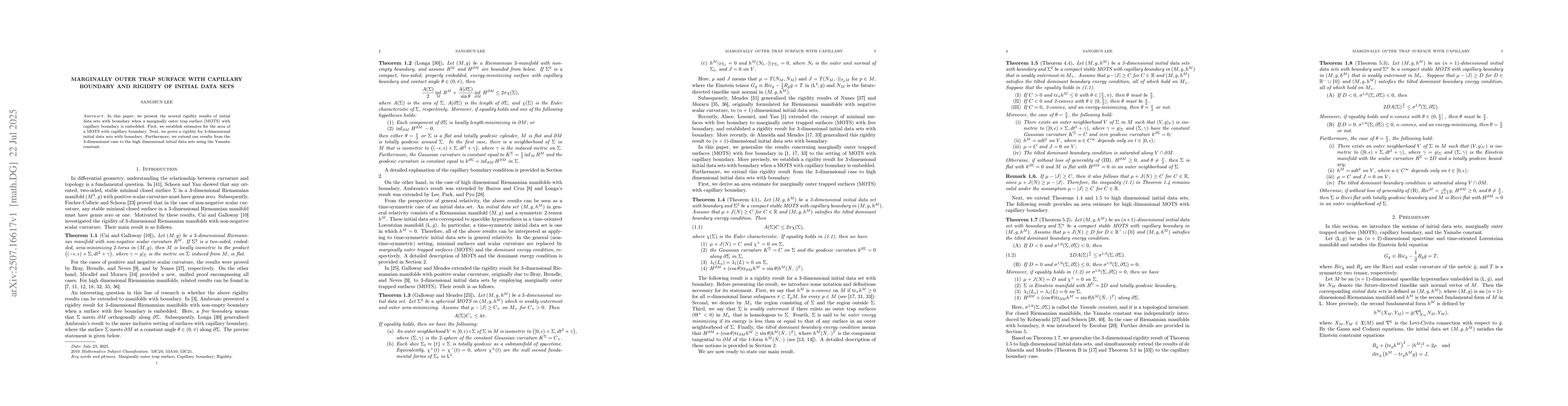 In this paper, we present the several rigidity results of initial data sets with boundary when a marginally outer trap surface (MOTS) with capillary boundary is embedded. First, we establish estimates for the area of a MOTS with capillary boundary. Next, we prove a rigidity for 3-dimensional initial data sets with boundary. Furthermore, we extend our results from the 3-dimensional case to the high dimensional initial data sets using the Yamabe constant.