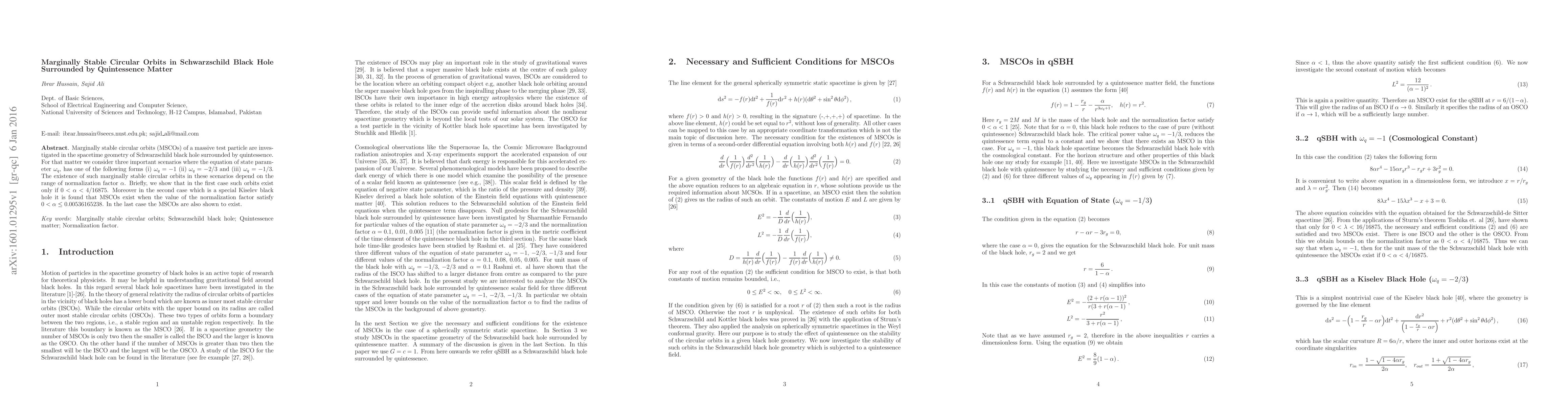 Marginally stable circular orbits (MSCOs) of a massive test particle are investigated in the spacetime geometry of Schwarzschild black hole surrounded by quintessence. For that matter we consider three important scenarios where the equation of state parameter $\omega_{q}$, has one of the following forms (i) $\omega_q=-1$ (ii) $\omega_q=-2/3$ and (iii) $\omega_q= -1/3$. The existence of such marginally stable circular orbits in these scenarios depend on the range of normalization factor $\alpha$. Briefly, we show that in the first case such orbits exist only if $0<\alpha<4/16875$. Moreover in the second case which is a special Kiselev black hole it is found that MSCOs exist when the value of the normalization factor satisfy $0<\alpha\leq 0.00536165238$. In the last case the MSCOs are also shown to exist.