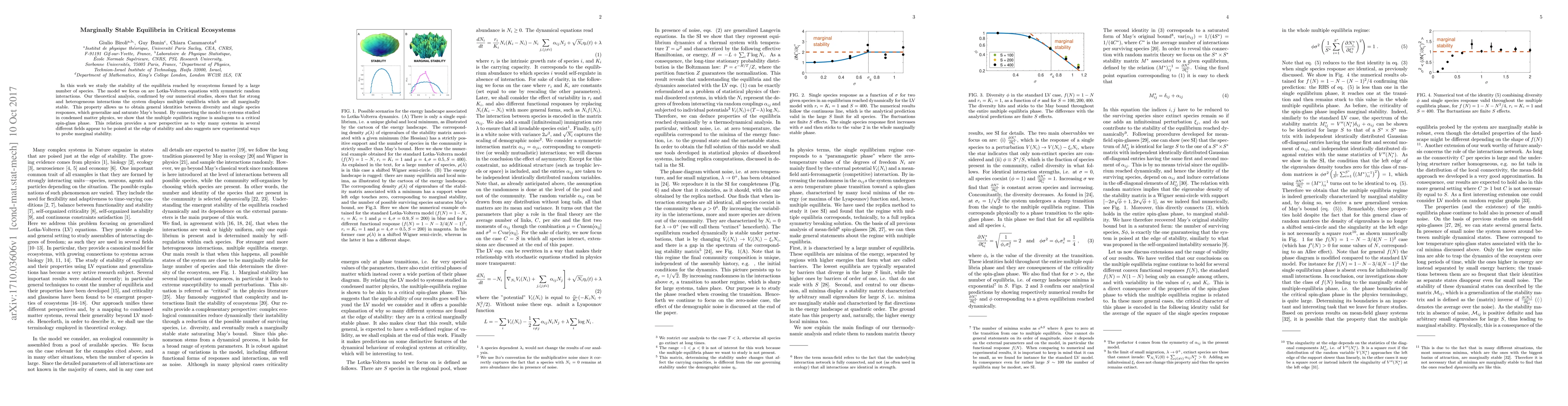 This paper investigates the stability of ecosystems modeled by Lotka-Volterra equations with random interactions, revealing that strong, heterogeneous interactions lead to multiple marginally stable equilibria. This marginal stability generalizes May's diversity-stability relationship and connects to critical spin-glass phases in condensed matter physics, offering new insights into the stability of complex systems.