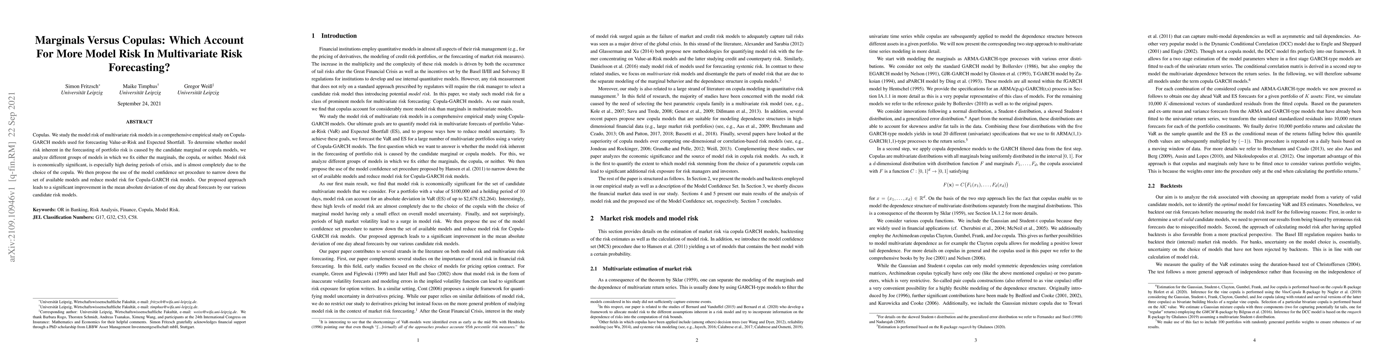 Copulas. We study the model risk of multivariate risk models in a comprehensive empirical study on Copula-GARCH models used for forecasting Value-at-Risk and Expected Shortfall. To determine whether model risk inherent in the forecasting of portfolio risk is caused by the candidate marginal or copula models, we analyze different groups of models in which we fix either the marginals, the copula, or neither. Model risk is economically significant, is especially high during periods of crisis, and is almost completely due to the choice of the copula. We then propose the use of the model confidence set procedure to narrow down the set of available models and reduce model risk for Copula-GARCH risk models. Our proposed approach leads to a significant improvement in the mean absolute deviation of one day ahead forecasts by our various candidate risk models.