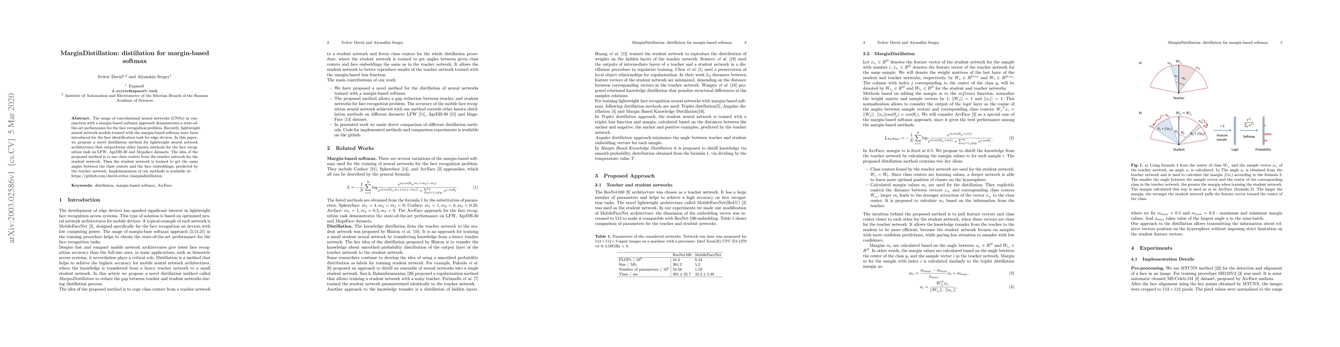 This paper introduces MarginDistillation, a novel distillation method for lightweight neural networks used in face recognition. It outperforms existing methods by training student networks to match class centers and angles between these centers and face embeddings, as predicted by a teacher network.