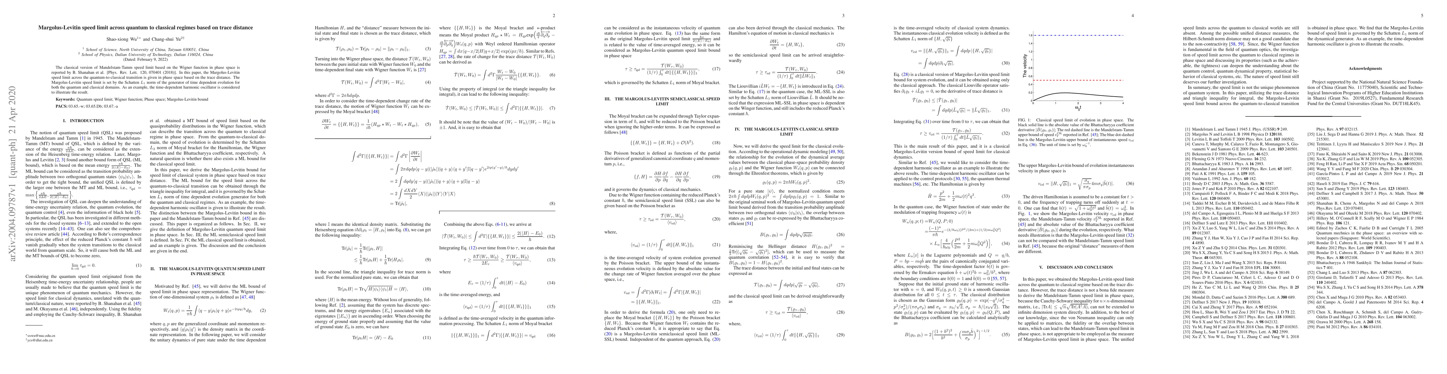 This paper establishes a Margolus-Levitin speed limit across quantum-to-classical regimes using trace distance in phase space, setting the limit by the Schatten L1 norm of the time-dependent evolution generator. The time-dependent harmonic oscillator is used to exemplify the findings.