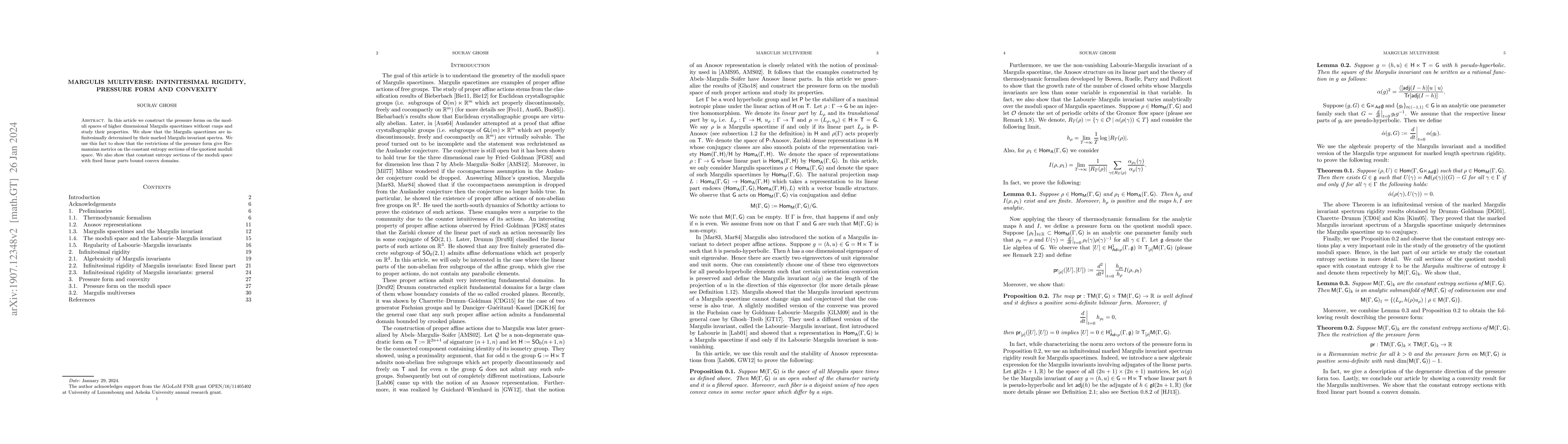 This paper constructs the pressure form on the moduli space of higher-dimensional Margulis spacetimes and demonstrates their infinitesimal rigidity. It also shows that constant entropy sections of the moduli space, with fixed linear part, form convex domains.