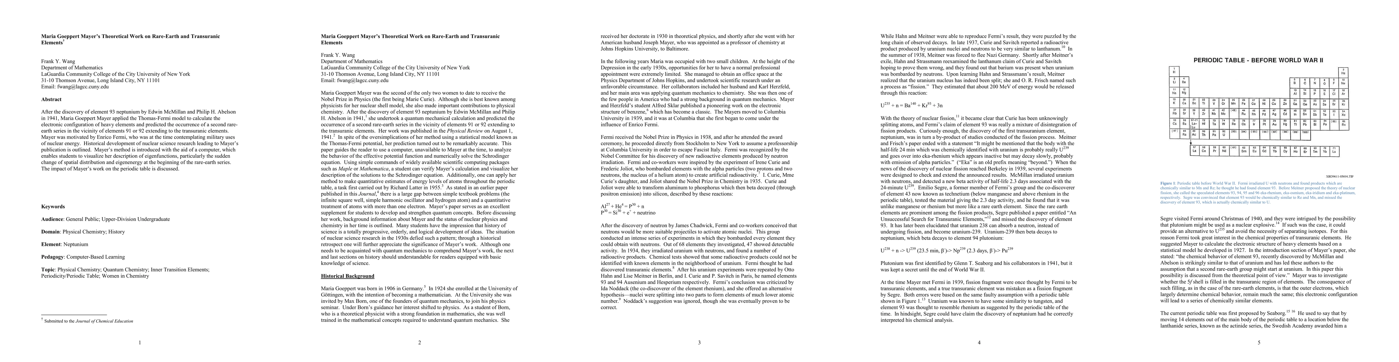 After the discovery of element 93 neptunium by Edwin McMillan and Philip H. Abelson in 1941, Maria Goeppert Mayer applied the Thomas-Fermi model to calculate the electronic configuration of heavy elements and predicted the occurrence of a second rare-earth series in the vicinity of elements 91 or 92 extending to the transuranic elements. Mayer was motivated by Enrico Fermi, who was at the time contemplating military uses of nuclear energy. Historical development of nuclear science research leading to Mayer's publication is outlined. Mayer's method is introduced with the aid of a computer, which enables students to visualize her description of eigenfunctions, particularly the sudden change of spatial distribution and eigenenergy at the beginning of the rare-earth series. The impact of Mayer's work on the periodic table is discussed.
