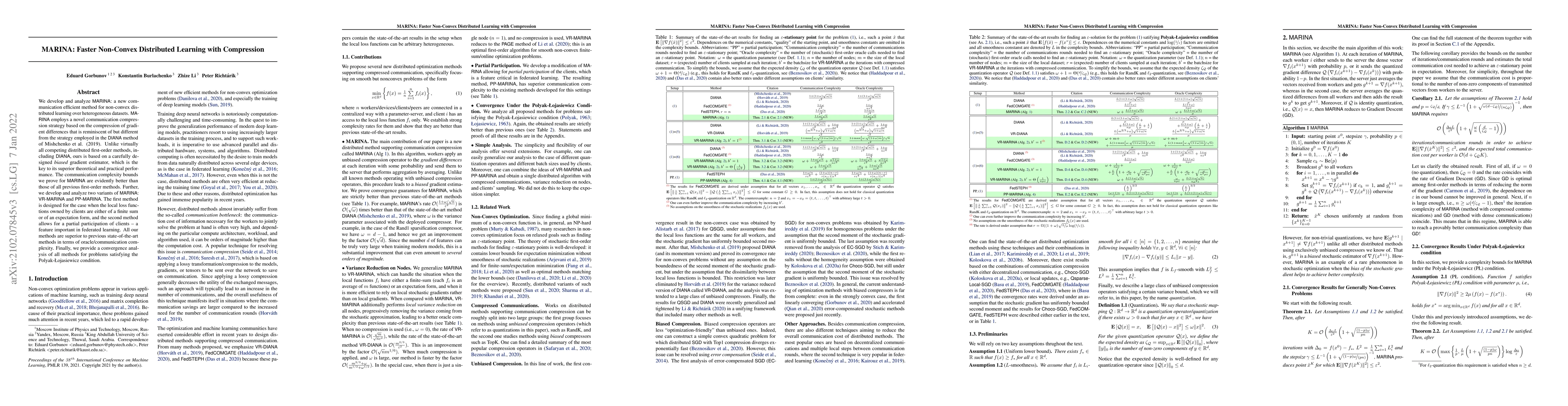 The paper introduces MARINA, a novel communication-efficient method for non-convex distributed learning. It outperforms previous methods with a unique biased gradient estimator and improved communication complexity bounds. MARINA has variants for different local loss forms and partial client participation, both demonstrating superior performance in oracle/communication complexity, especially under the Polyak-Lojasiewicz condition.