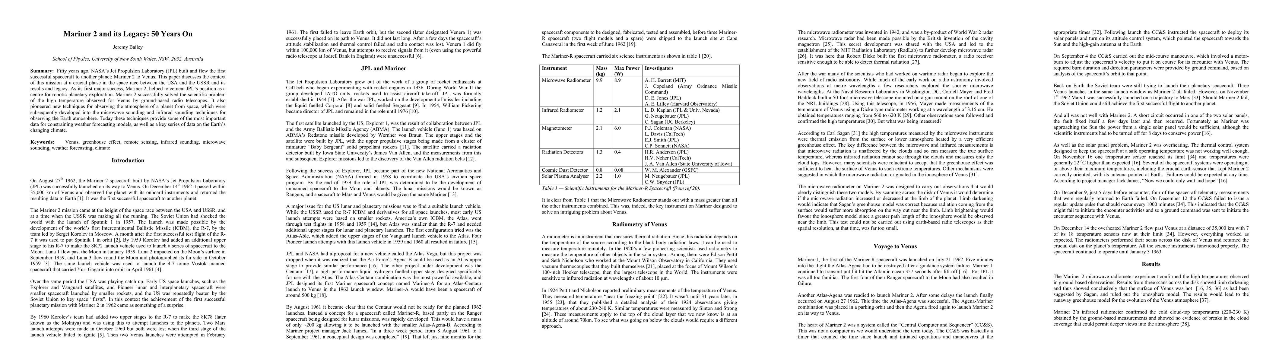 Fifty years ago, NASA's Jet Propulsion Laboratory (JPL) built and flew the first successful spacecraft to another planet: Mariner 2 to Venus. This paper discusses the context of this mission at a crucial phase in the space race between the USA and USSR and its results and legacy. As its first major success, Mariner 2 helped to cement JPL's position as a centre for robotic planetary exploration. Mariner 2 successfully solved the scientific problem of the high temperature observed for Venus by ground-based radio telescopes. It also pioneered new techniques for observing the atmosphere of a planet from space, which were subsequently developed into the microwave sounding and infrared sounding techniques for observing the Earth atmosphere. Today these techniques provide some of the most important data for constraining weather forecasting models, as well as a key series of data on the Earth's changing climate.