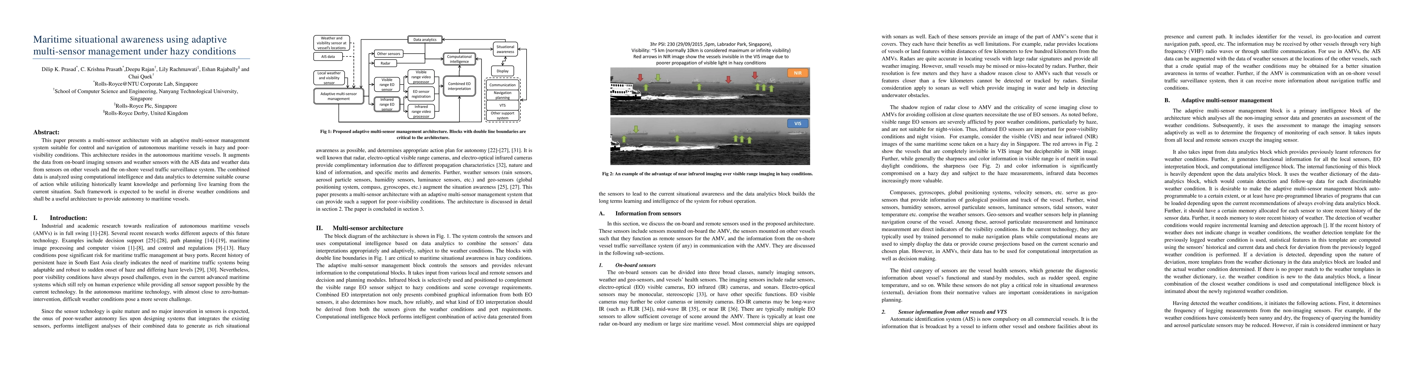 This paper presents a multi-sensor architecture with an adaptive multi-sensor management system suitable for control and navigation of autonomous maritime vessels in hazy and poor-visibility conditions. This architecture resides in the autonomous maritime vessels. It augments the data from on-board imaging sensors and weather sensors with the AIS data and weather data from sensors on other vessels and the on-shore vessel traffic surveillance system. The combined data is analyzed using computational intelligence and data analytics to determine suitable course of action while utilizing historically learnt knowledge and performing live learning from the current situation. Such framework is expected to be useful in diverse weather conditions and shall be a useful architecture to provide autonomy to maritime vessels.