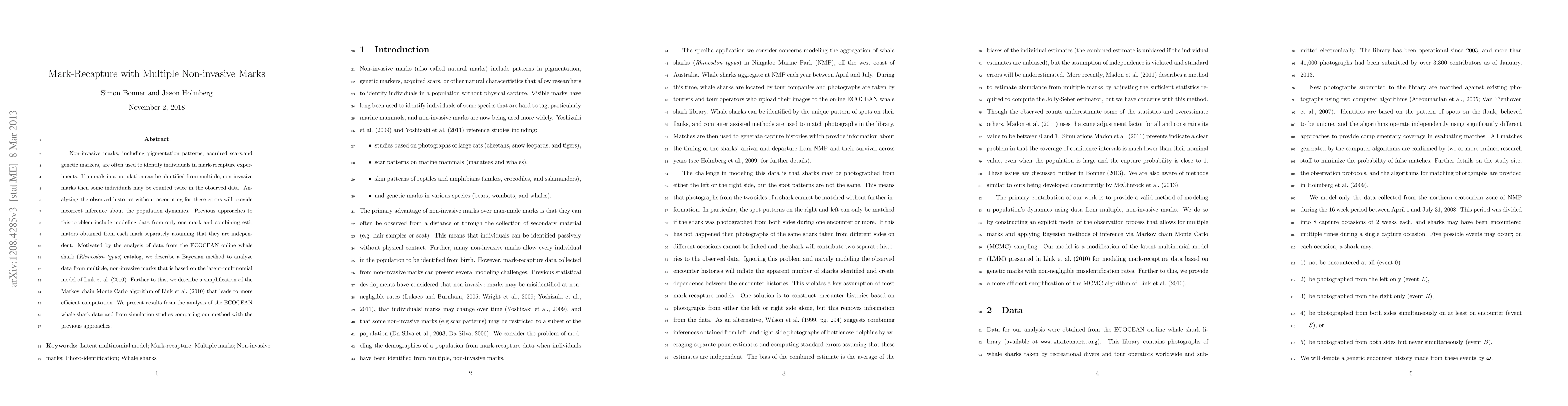 Non-invasive marks, including pigmentation patterns, acquired scars,and genetic mark- ers, are often used to identify individuals in mark-recapture experiments. If animals in a population can be identified from multiple, non-invasive marks then some individuals may be counted twice in the observed data. Analyzing the observed histories without accounting for these errors will provide incorrect inference about the population dynamics. Previous approaches to this problem include modeling data from only one mark and combining estimators obtained from each mark separately assuming that they are independent. Motivated by the analysis of data from the ECOCEAN online whale shark (Rhincodon typus) catalog, we describe a Bayesian method to analyze data from multiple, non-invasive marks that is based on the latent-multinomial model of Link et al. (2010). Further to this, we describe a simplification of the Markov chain Monte Carlo algorithm of Link et al. (2010) that leads to more efficient computation. We present results from the analysis of the ECOCEAN whale shark data and from simulation studies comparing our method with the previous approaches.