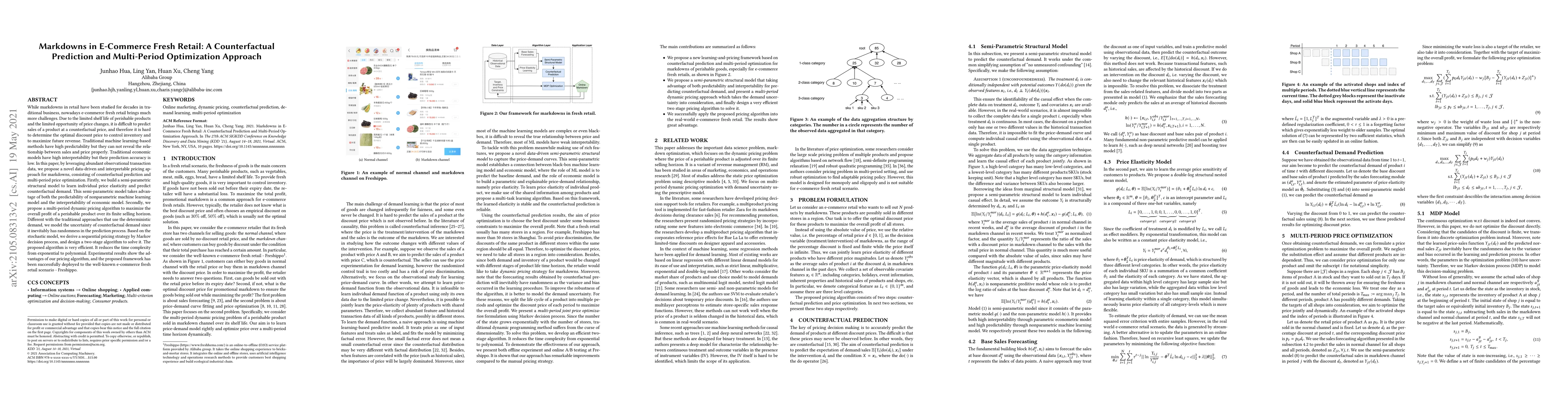 In this paper, by leveraging abundant observational transaction data, we propose a novel data-driven and interpretable pricing approach for markdowns, consisting of counterfactual prediction and multi-period price optimization. Firstly, we build a semi-parametric structural model to learn individual price elasticity and predict counterfactual demand. This semi-parametric model takes advantage of both the predictability of nonparametric machine learning model and the interpretability of economic model. Secondly, we propose a multi-period dynamic pricing algorithm to maximize the overall profit of a perishable product over its finite selling horizon. Different with the traditional approaches that use the deterministic demand, we model the uncertainty of counterfactual demand since it inevitably has randomness in the prediction process. Based on the stochastic model, we derive a sequential pricing strategy by Markov decision process, and design a two-stage algorithm to solve it. The proposed algorithm is very efficient. It reduces the time complexity from exponential to polynomial. Experimental results show the advantages of our pricing algorithm, and the proposed framework has been successfully deployed to the well-known e-commerce fresh retail scenario - Freshippo.