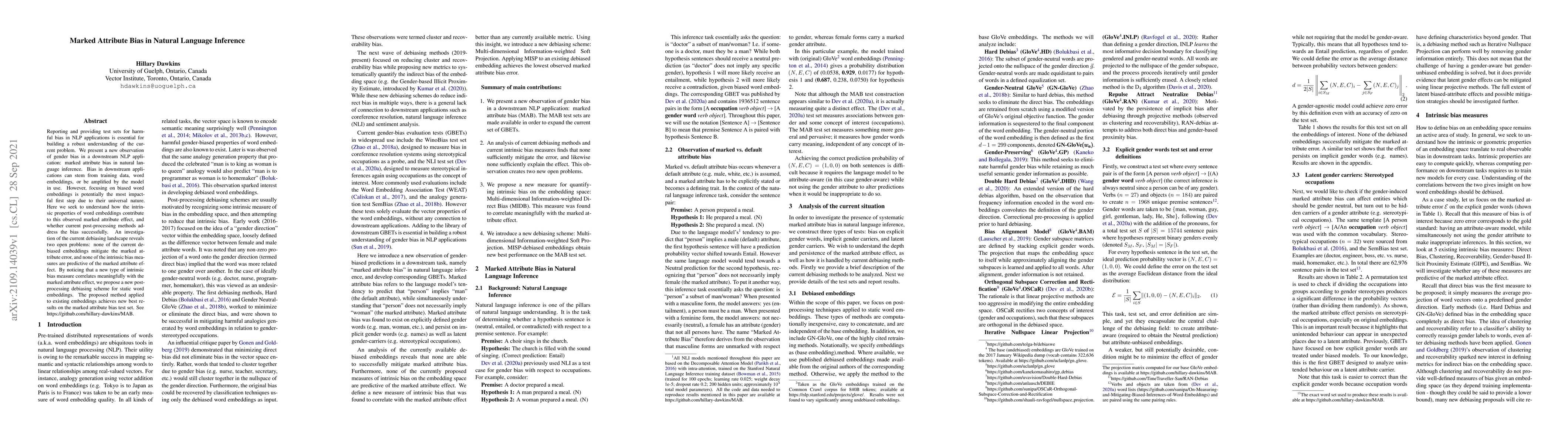 Reporting and providing test sets for harmful bias in NLP applications is essential for building a robust understanding of the current problem. We present a new observation of gender bias in a downstream NLP application: marked attribute bias in natural language inference. Bias in downstream applications can stem from training data, word embeddings, or be amplified by the model in use. However, focusing on biased word embeddings is potentially the most impactful first step due to their universal nature. Here we seek to understand how the intrinsic properties of word embeddings contribute to this observed marked attribute effect, and whether current post-processing methods address the bias successfully. An investigation of the current debiasing landscape reveals two open problems: none of the current debiased embeddings mitigate the marked attribute error, and none of the intrinsic bias measures are predictive of the marked attribute effect. By noticing that a new type of intrinsic bias measure correlates meaningfully with the marked attribute effect, we propose a new postprocessing debiasing scheme for static word embeddings. The proposed method applied to existing embeddings achieves new best results on the marked attribute bias test set. See https://github.com/hillary-dawkins/MAB.