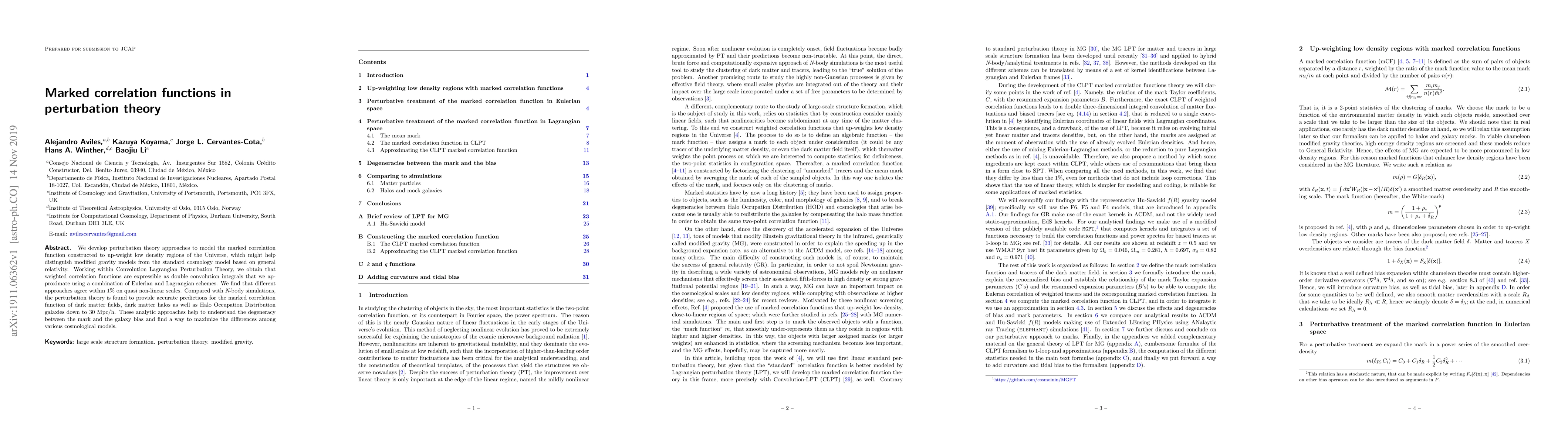 The paper formally develops the perturbative theory of marks using dark matter and tracers for general gravity models, applying it to ΛCDM and modified gravity models to enhance differences that could eventually serve to discriminate among them with simulations and observations.