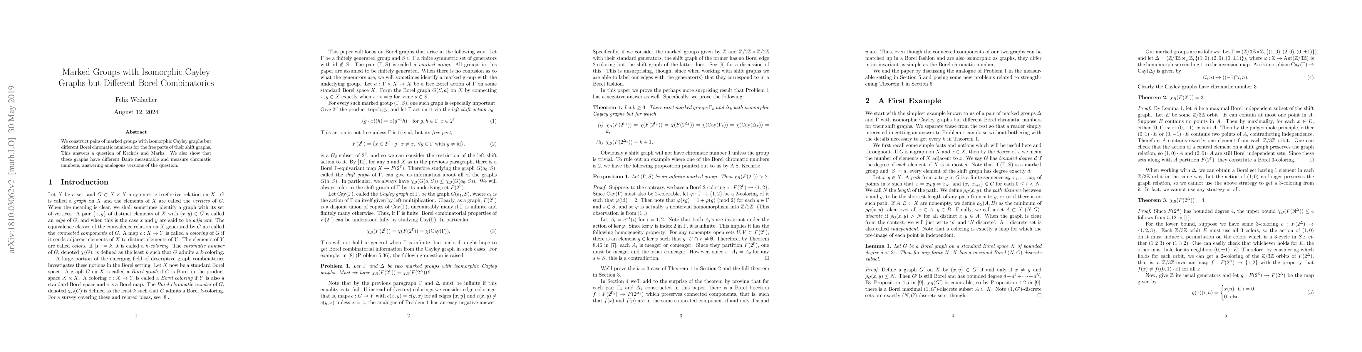 Researchers created pairs of marked groups with isomorphic Cayley graphs but different chromatic numbers for their shift graphs, answering a question posed by Kechris and Marks.