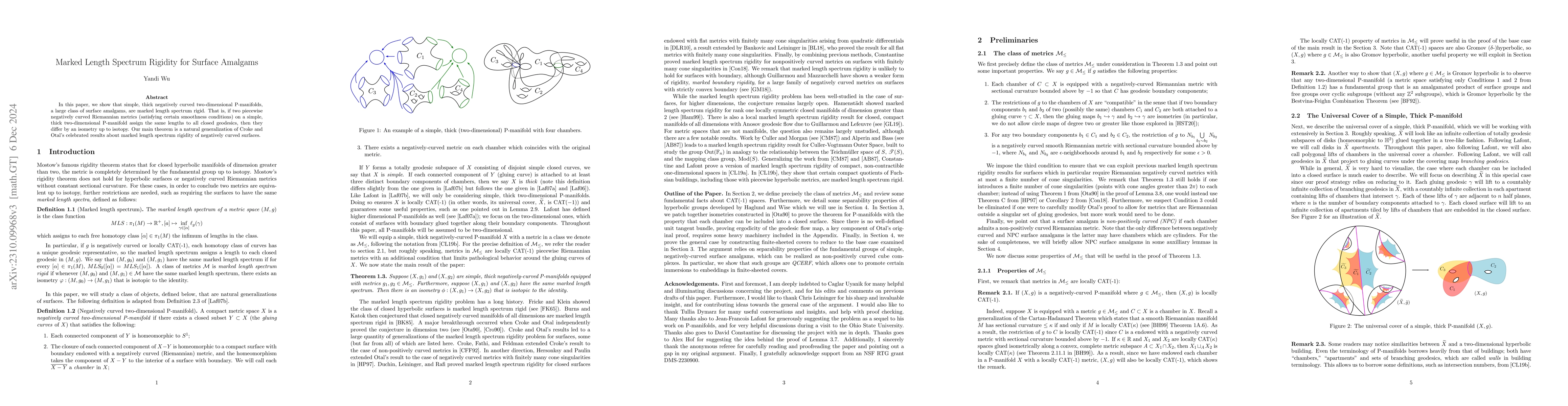 The paper demonstrates that simple, thick negatively curved two-dimensional P-manifolds (surface amalgams) exhibit marked length spectrum rigidity, meaning any two metrics with identical geodesic lengths differ only by an isometry up to isotopy. This extends Croke and Otal's results on negatively curved surfaces.