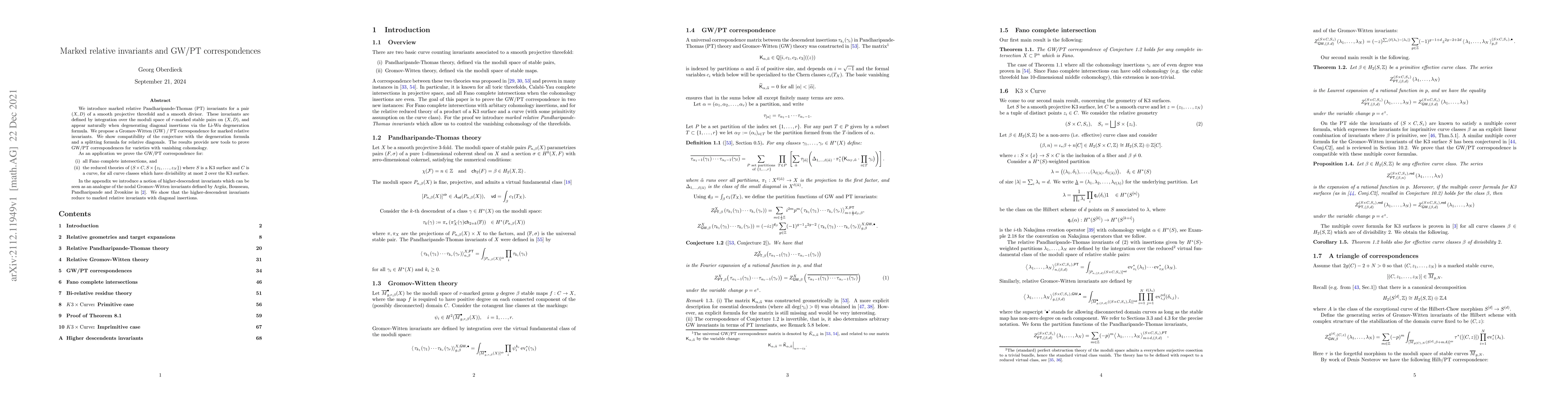 This paper introduces marked relative Pandharipande-Thomas invariants for pairs of smooth projective threefolds and divisors, proposing a Gromov-Witten/PT correspondence for these invariants. It demonstrates the correspondence's compatibility with degeneration and splitting formulas, and applies it to prove the GW/PT correspondence for Fano complete intersections and certain K3 surface configurations.