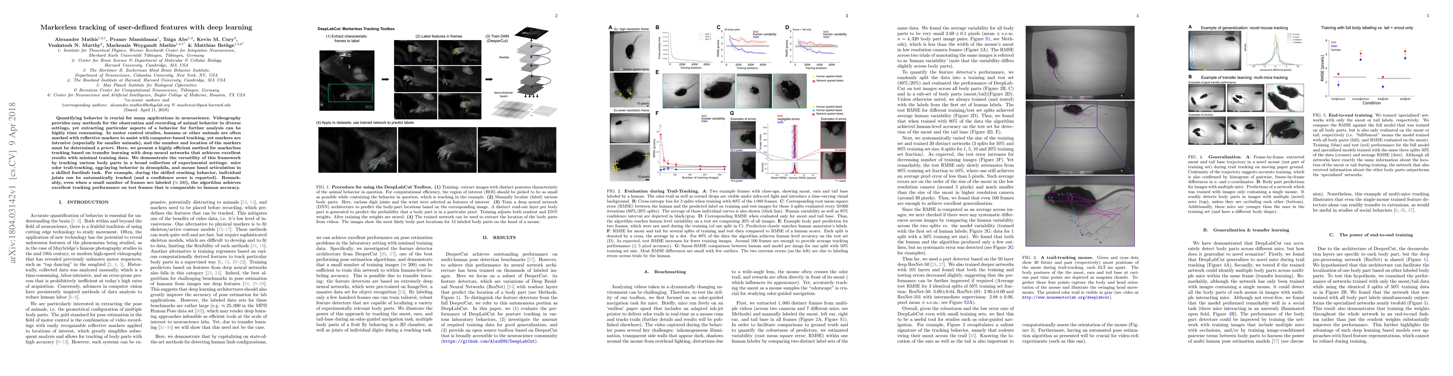 This paper introduces a deep learning-based method for markerless tracking of user-defined features, demonstrating its effectiveness in various behavioral studies with minimal training data. The approach achieves high accuracy comparable to human performance, even with limited labeled frames, and is versatile across different experimental settings.