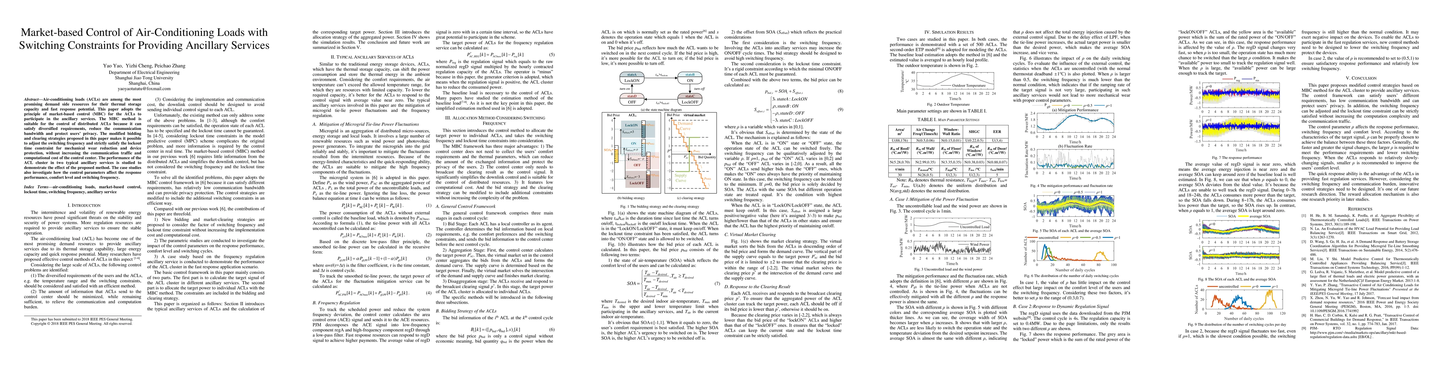 Air-conditioning loads (ACLs) are among the most promising demand side resources for their thermal storage capacity and fast response potential. This paper adopts the principle of market-based control (MBC) for the ACLs to participate in the ancillary services. The MBC method is suitable for the control of distributed ACLs because it can satisfy diversified requirements, reduce the communication bandwidth and protect users' privacy. The modified bidding and clearing strategies proposed in this paper makes it possible to adjust the switching frequency and strictly satisfy the lockout time constraint for mechanical wear reduction and device protection, without increasing the communication traffic and computational cost of the control center. The performance of the ACL cluster in two typical ancillary services is studied to demonstrate the effect of the proposed method. The case studies also investigate how the control parameters affect the response performance, comfort level and switching frequency.