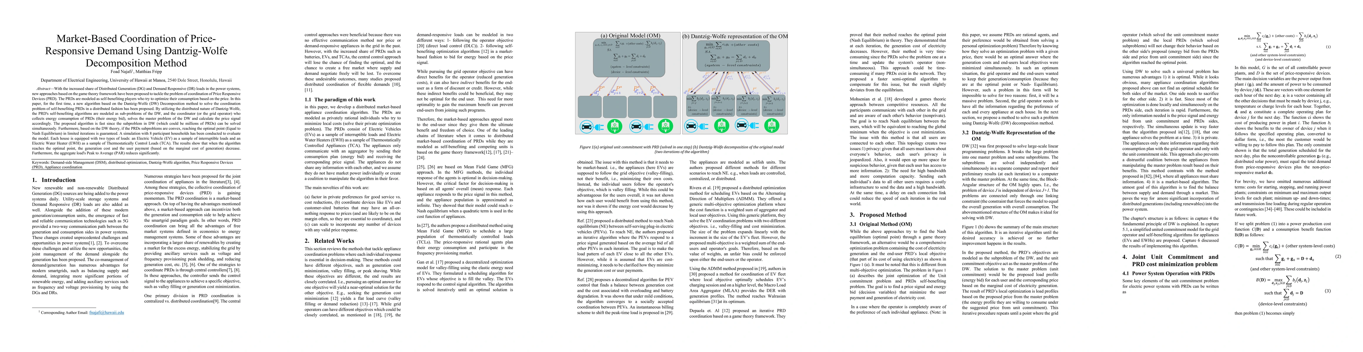 This paper proposes a Dantzig-Wolfe Decomposition method to coordinate price-responsive demand in power systems with distributed generation and demand-responsive loads. The method allows self-benefiting Price Responsive Devices to optimize consumption based on price signals, leading to reduced generation costs and lower peak-to-average load ratios.