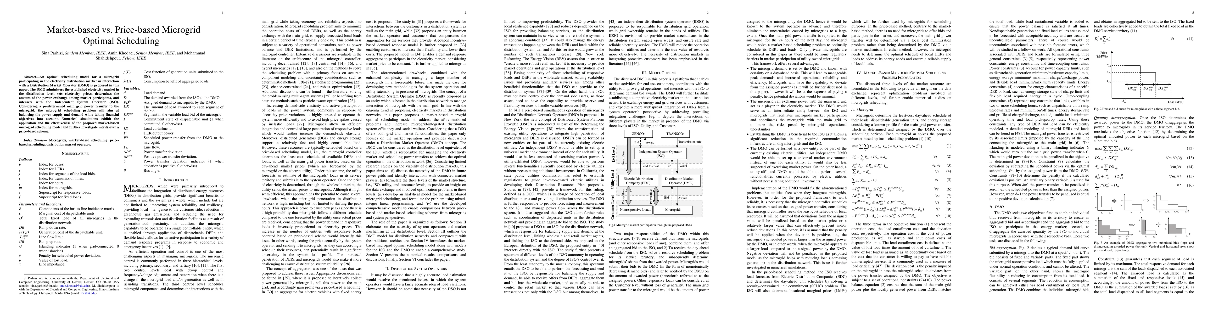 This paper proposes an optimal scheduling model for microgrids in electricity distribution markets, comparing market-based and price-based approaches. Numerical simulations show the effectiveness of the market-based model in balancing supply and demand while achieving financial objectives, outperforming the price-based scheme.