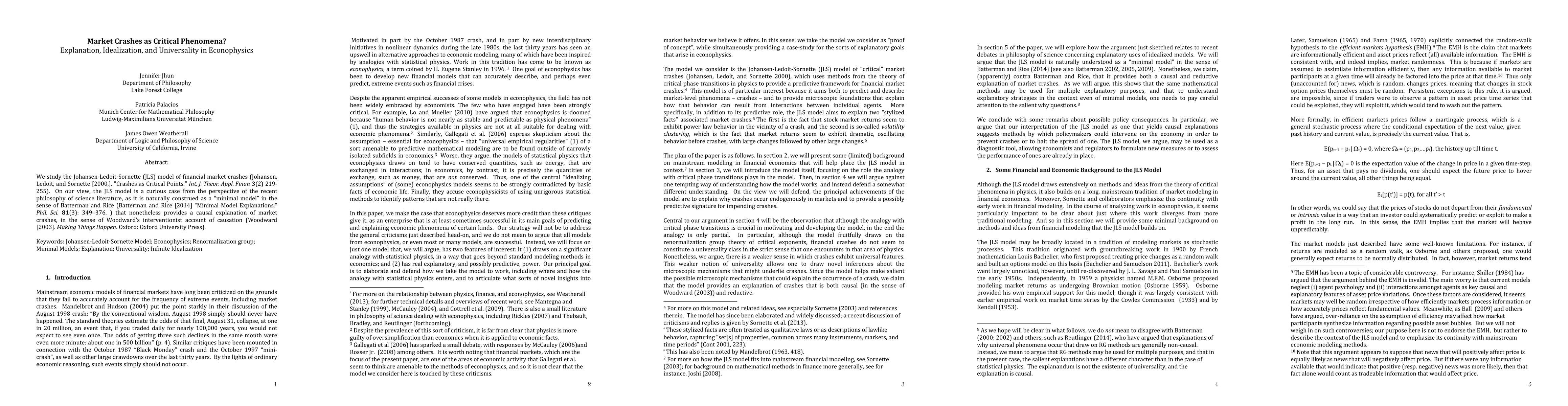We study the Johansen-Ledoit-Sornette (JLS) model of financial market crashes (Johansen, Ledoit, and Sornette [2000] "Crashes as Critical Points." Int. J. Theor. Appl. Finan. 3(2) 219-255). On our view, the JLS model is a curious case from the perspective of the recent philosophy of science literature, as it is naturally construed as a "minimal model" in the sense of Batterman and Rice (Batterman and Rice [2014] "Minimal Model Explanations." Phil. Sci. 81(3): 349-376) that nonetheless provides a causal explanation of market crashes, in the sense of Woodward's interventionist account of causation (Woodward [2003]. Making Things Happen. Oxford:Oxford University Press).