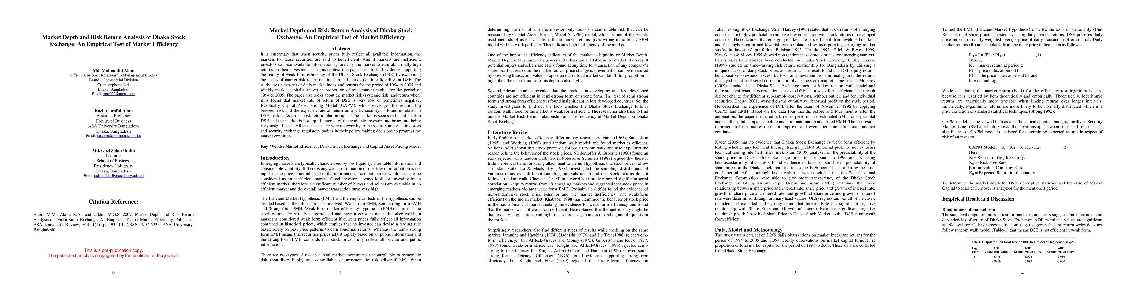 This paper investigates the weak-form efficiency of the Dhaka Stock Exchange (DSE) by analyzing market risk-return relationships and market depth. Findings suggest that DSE exhibits low or negative market returns and a deficient risk-return relationship, indicating market inefficiency and low liquidity.