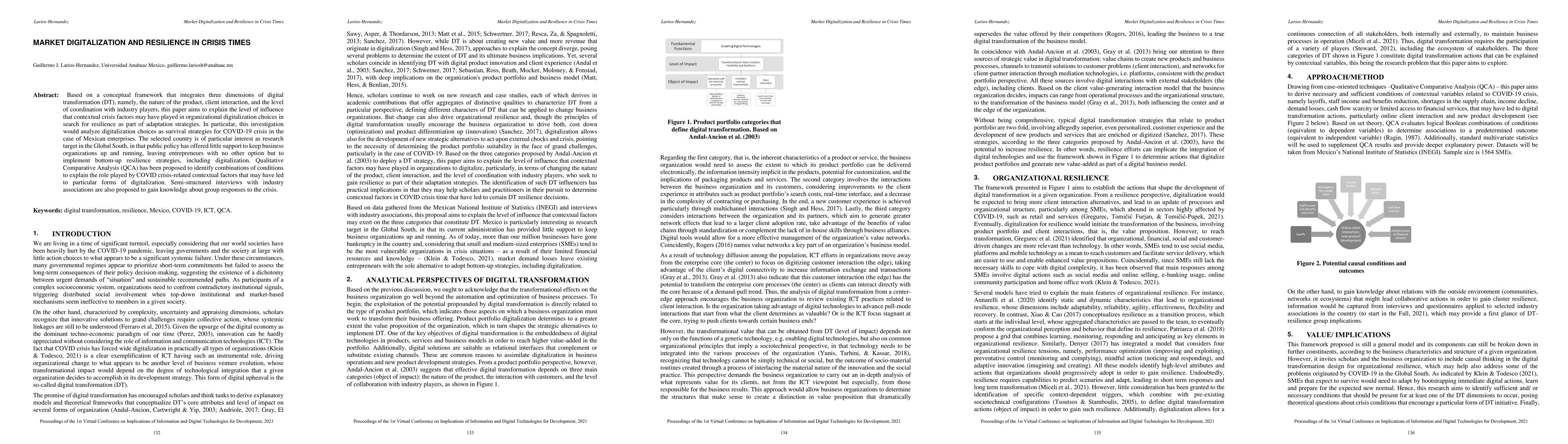 Based on a conceptual framework that integrates three dimensions of digital transformation (DT), namely, the nature of the product, client interaction, and the level of coordination with industry players, this paper aims to explain the level of influence that contextual crisis factors may have played in organizational digitalization choices in search for resilience as part of adaptation strategies. In particular, this investigation would analyze digitalization choices as survival strategies for COVID-19 crisis in the case of Mexican enterprises. The selected country is of particular interest as research target in the Global South, in that public policy has offered little support to keep business organizations up and running, leaving entrepreneurs with no other option but to implement bottom-up resilience strategies, including digitalization. Qualitative Comparative Analysis (QCA) has been proposed to identify combinations of conditions to explain the role played by COVID crisis-related contextual factors that may have led to particular forms of digitalization. Semi-structured interviews with industry associations are also proposed to gain knowledge about group responses to the crisis.