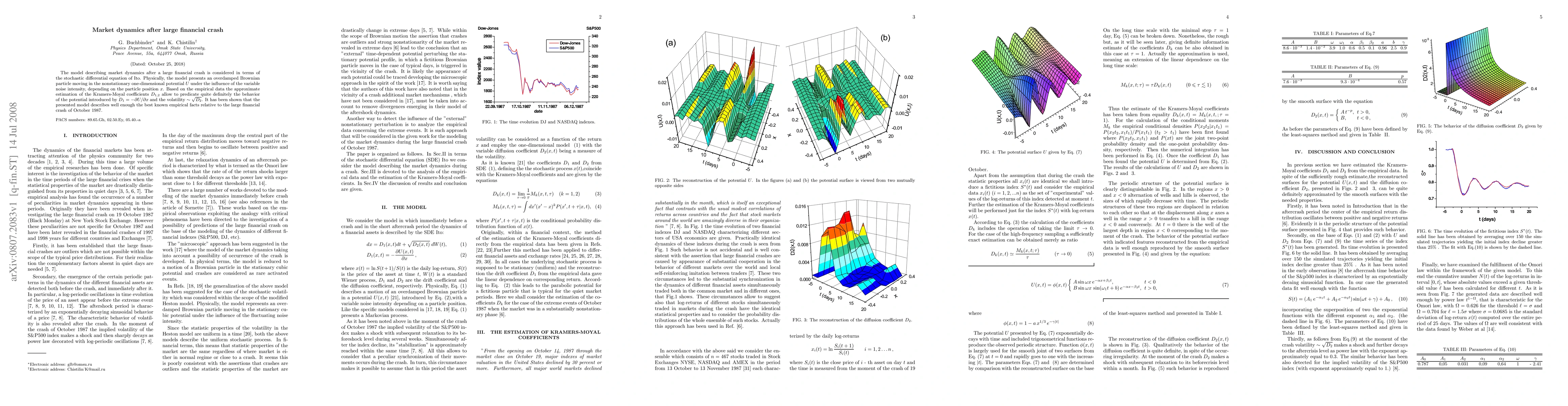 The model describing market dynamics after a large financial crash is considered in terms of the stochastic differential equation of Ito. Physically, the model presents an overdamped Brownian particle moving in the nonstationary one-dimensional potential $U$ under the influence of the variable noise intensity, depending on the particle position $x$. Based on the empirical data the approximate estimation of the Kramers-Moyal coefficients $D_{1,2}$ allow to predicate quite definitely the behavior of the potential introduced by $D_1 = - \partial U /\partial x$ and the volatility $\sim \sqrt{D_2}$. It has been shown that the presented model describes well enough the best known empirical facts relative to the large financial crash of October 1987. \