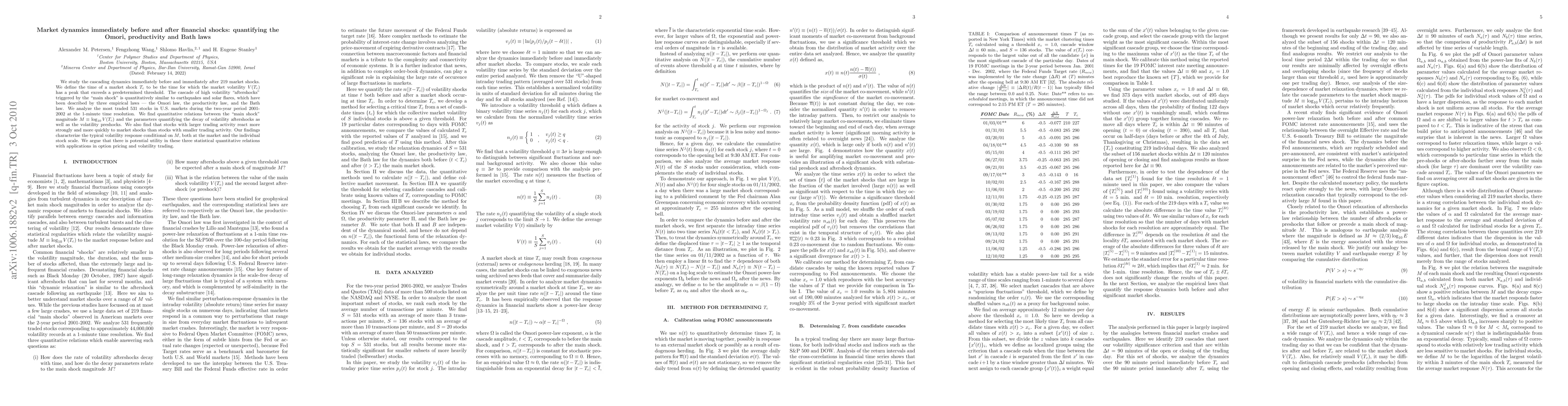 We study the cascading dynamics immediately before and immediately after 219 market shocks. We define the time of a market shock T_{c} to be the time for which the market volatility V(T_{c}) has a peak that exceeds a predetermined threshold. The cascade of high volatility "aftershocks" triggered by the "main shock" is quantitatively similar to earthquakes and solar flares, which have been described by three empirical laws --- the Omori law, the productivity law, and the Bath law. We analyze the most traded 531 stocks in U.S. markets during the two-year period 2001-2002 at the 1-minute time resolution. We find quantitative relations between (i) the "main shock" magnitude M \equiv \log V(T_{c}) occurring at the time T_{c} of each of the 219 "volatility quakes" analyzed, and (ii) the parameters quantifying the decay of volatility aftershocks as well as the volatility preshocks. We also find that stocks with larger trading activity react more strongly and more quickly to market shocks than stocks with smaller trading activity. Our findings characterize the typical volatility response conditional on M, both at the market and the individual stock scale. We argue that there is potential utility in these three statistical quantitative relations with applications in option pricing and volatility trading.
