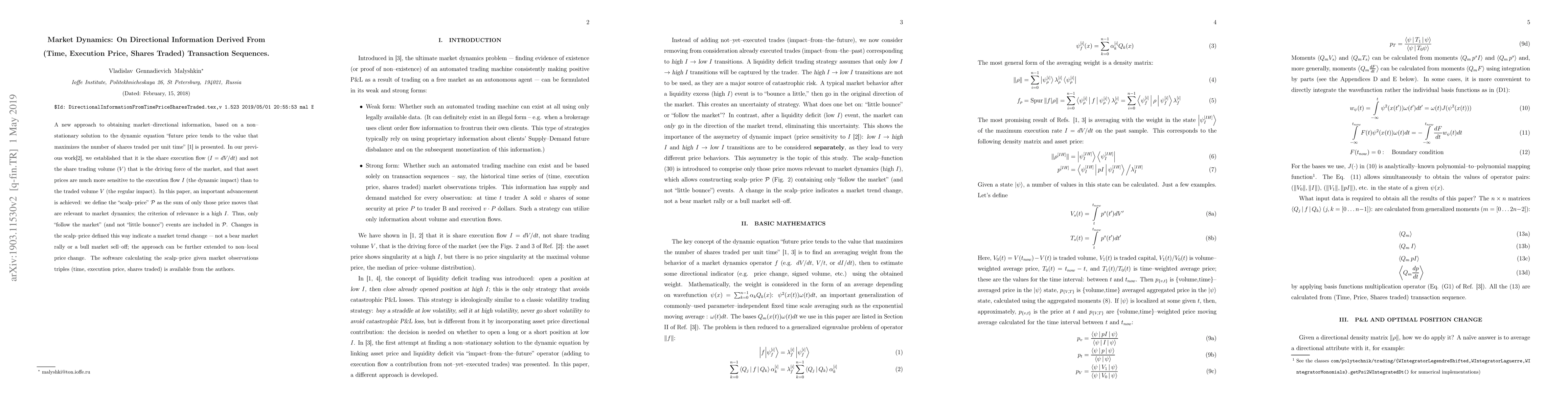 A new approach to obtaining market--directional information, based on a non-stationary solution to the dynamic equation "future price tends to the value that maximizes the number of shares traded per unit time" [1] is presented. In our previous work[2], we established that it is the share execution flow ($I=dV/dt$) and not the share trading volume ($V$) that is the driving force of the market, and that asset prices are much more sensitive to the execution flow $I$ (the dynamic impact) than to the traded volume $V$ (the regular impact). In this paper, an important advancement is achieved: we define the "scalp-price" ${\cal P}$ as the sum of only those price moves that are relevant to market dynamics; the criterion of relevance is a high $I$. Thus, only "follow the market" (and not "little bounce") events are included in ${\cal P}$. Changes in the scalp-price defined this way indicate a market trend change - not a bear market rally or a bull market sell-off; the approach can be further extended to non-local price change. The software calculating the scalp--price given market observations triples (time, execution price, shares traded) is available from the authors.
