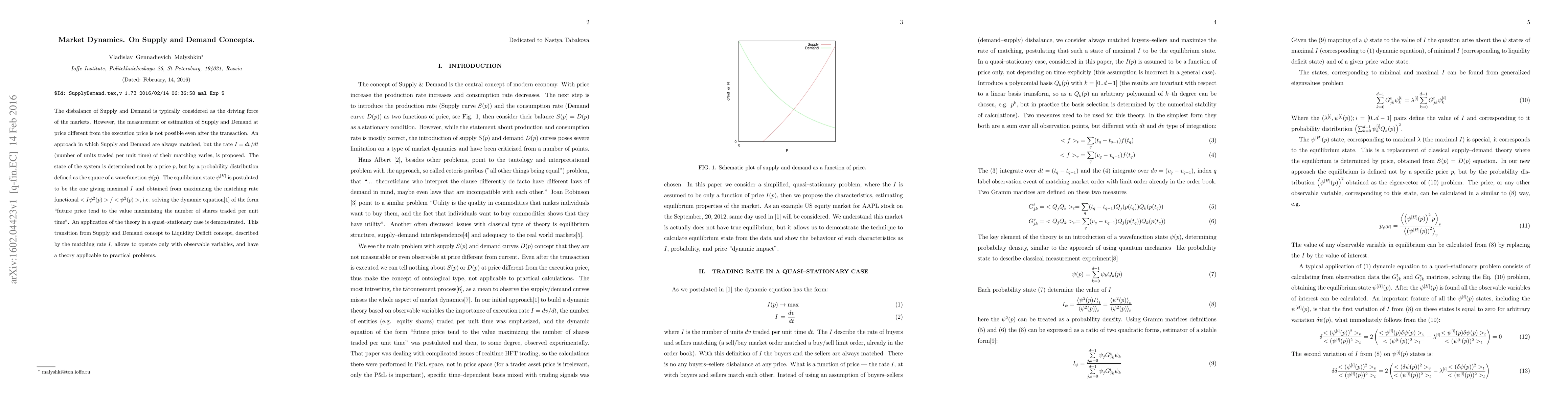 The disbalance of Supply and Demand is typically considered as the driving force of the markets. However, the measurement or estimation of Supply and Demand at price different from the execution price is not possible even after the transaction. An approach in which Supply and Demand are always matched, but the rate $I=dv/dt$ (number of units traded per unit time) of their matching varies, is proposed. The state of the system is determined not by a price $p$, but by a probability distribution defined as the square of a wavefunction $\psi(p)$. The equilibrium state $\psi^{[H]}$ is postulated to be the one giving maximal $I$ and obtained from maximizing the matching rate functional $/<\psi^2(p)>$, i.e. solving the dynamic equation of the form "future price tend to the value maximizing the number of shares traded per unit time". An application of the theory in a quasi--stationary case is demonstrated. This transition from Supply and Demand concept to Liquidity Deficit concept, described by the matching rate $I$, allows to operate only with observable variables, and have a theory applicable to practical problems.