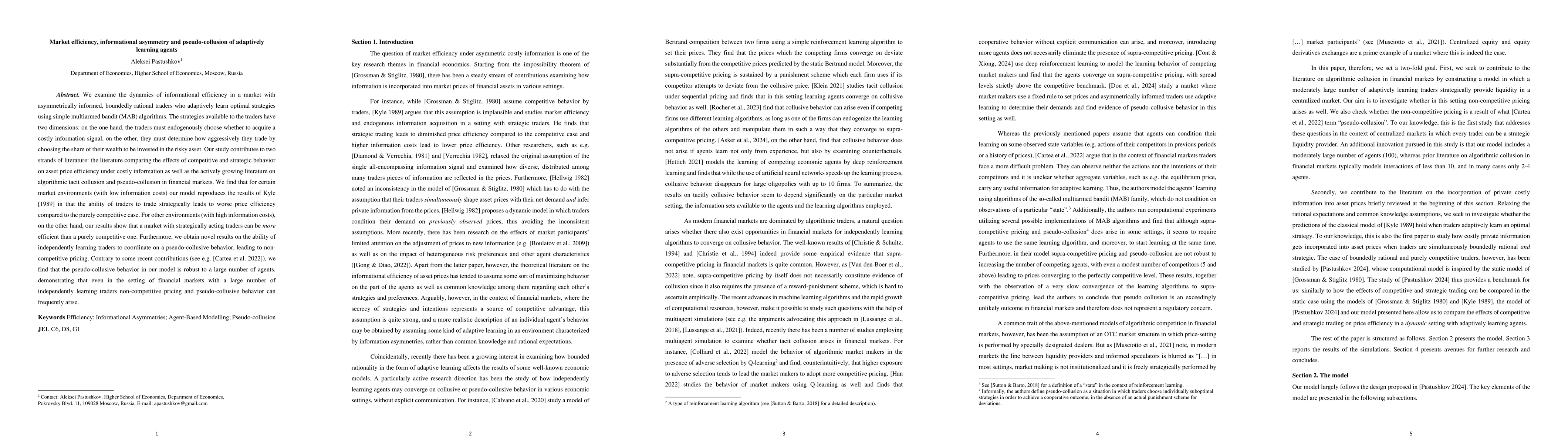 We examine the dynamics of informational efficiency in a market with asymmetrically informed, boundedly rational traders who adaptively learn optimal strategies using simple multiarmed bandit (MAB) algorithms. The strategies available to the traders have two dimensions: on the one hand, the traders must endogenously choose whether to acquire a costly information signal, on the other, they must determine how aggressively they trade by choosing the share of their wealth to be invested in the risky asset. Our study contributes to two strands of literature: the literature comparing the effects of competitive and strategic behavior on asset price efficiency under costly information as well as the actively growing literature on algorithmic tacit collusion and pseudo-collusion in financial markets. We find that for certain market environments (with low information costs) our model reproduces the results of Kyle [1989] in that the ability of traders to trade strategically leads to worse price efficiency compared to the purely competitive case. For other environments (with high information costs), on the other hand, our results show that a market with strategically acting traders can be more efficient than a purely competitive one. Furthermore, we obtain novel results on the ability of independently learning traders to coordinate on a pseudo-collusive behavior, leading to non-competitive pricing. Contrary to some recent contributions (see e.g. [Cartea et al. 2022]), we find that the pseudo-collusive behavior in our model is robust to a large number of agents, demonstrating that even in the setting of financial markets with a large number of independently learning traders non-competitive pricing and pseudo-collusive behavior can frequently arise.