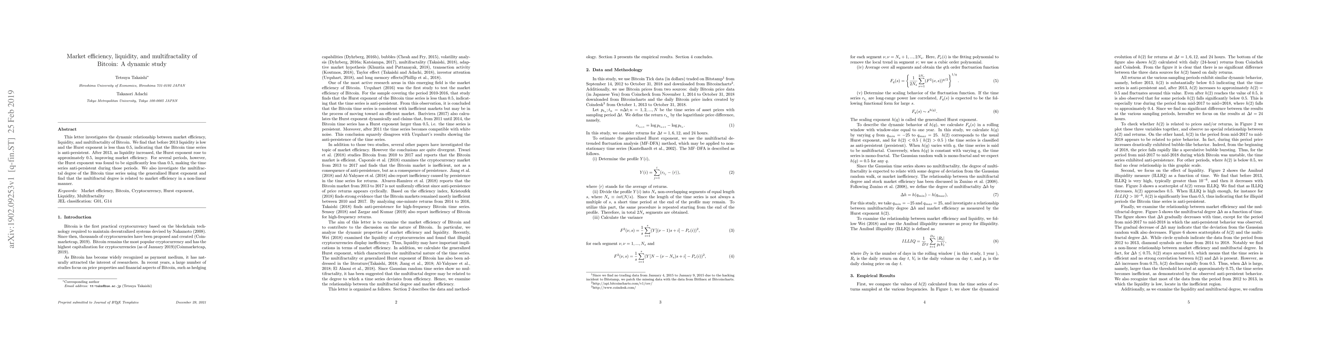 This letter investigates the dynamic relationship between market efficiency, liquidity, and multifractality of Bitcoin. We find that before 2013 liquidity is low and the Hurst exponent is less than 0.5, indicating that the Bitcoin time series is anti-persistent. After 2013, as liquidity increased, the Hurst exponent rose to approximately 0.5, improving market efficiency. For several periods, however, the Hurst exponent was found to be significantly less than 0.5, making the time series anti-persistent during those periods. We also investigate the multifractal degree of the Bitcoin time series using the generalized Hurst exponent and find that the multifractal degree is related to market efficiency in a non-linear manner.