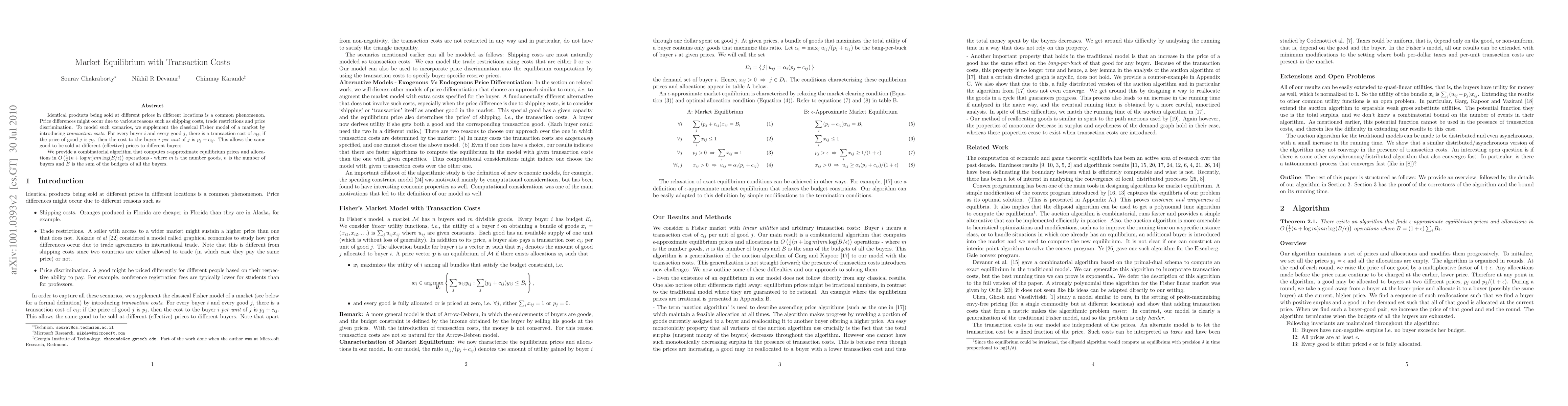A market equilibrium model is introduced to account for transaction costs, allowing identical goods to be sold at different prices in various locations. A combinatorial algorithm provides an efficient solution for finding epsilon-approximate equilibrium prices and allocations.