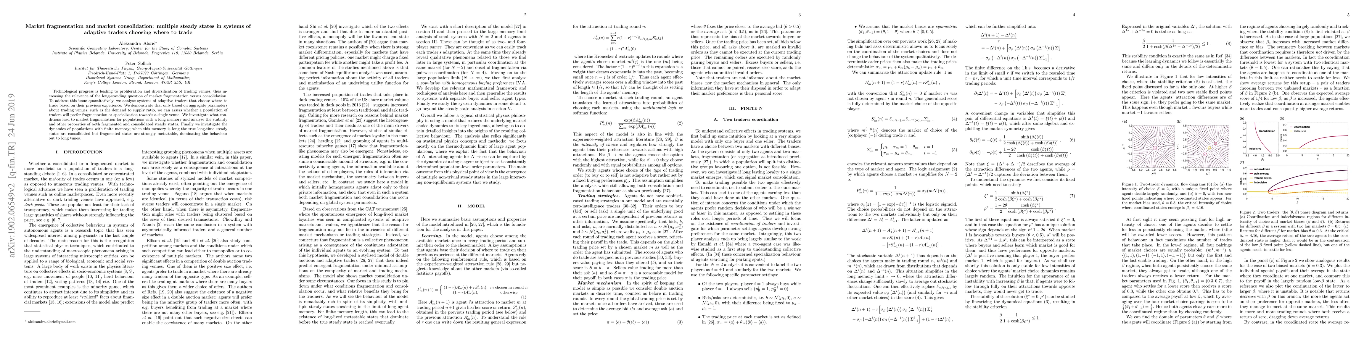Technological progress is leading to proliferation and diversification of trading venues, thus increasing the relevance of the long-standing question of market fragmentation versus consolidation. To address this issue quantitatively, we analyse systems of adaptive traders that choose where to trade based on their previous experience. We demonstrate that only based on aggregate parameters about trading venues, such as the demand to supply ratio, we can assess whether a population of traders will prefer fragmentation or specialization towards a single venue. We investigate what conditions lead to market fragmentation for populations with a long memory and analyse the stability and other properties of both fragmented and consolidated steady states. Finally we investigate the dynamics of populations with finite memory; when this memory is long the true long-time steady states are consolidated but fragmented states are strongly metastable, dominating the behaviour out to long times.