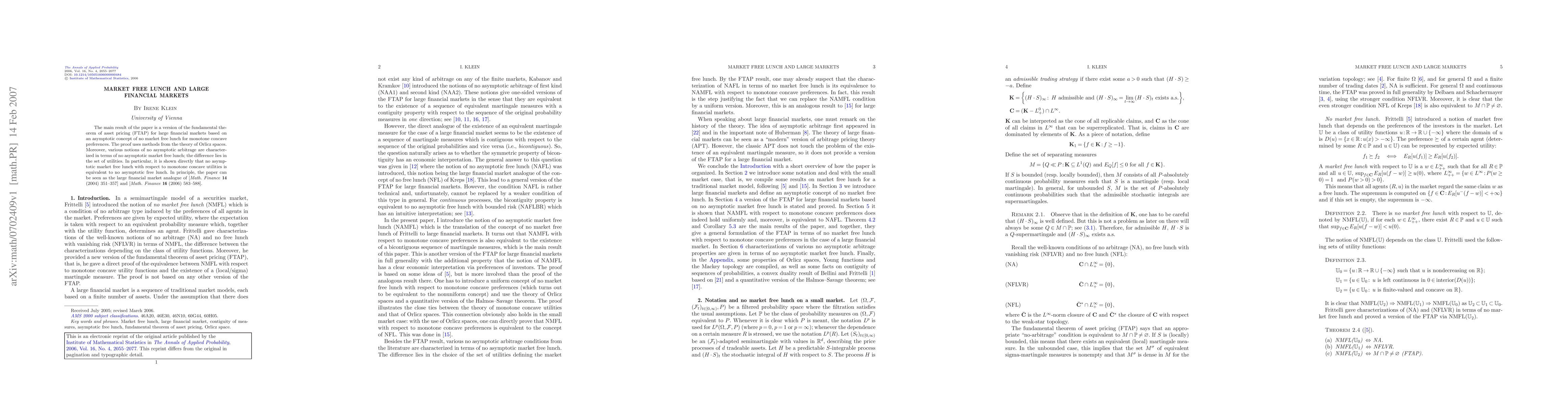 The main result of the paper is a version of the fundamental theorem of asset pricing (FTAP) for large financial markets based on an asymptotic concept of no market free lunch for monotone concave preferences. The proof uses methods from the theory of Orlicz spaces. Moreover, various notions of no asymptotic arbitrage are characterized in terms of no asymptotic market free lunch; the difference lies in the set of utilities. In particular, it is shown directly that no asymptotic market free lunch with respect to monotone concave utilities is equivalent to no asymptotic free lunch. In principle, the paper can be seen as the large financial market analogue of [Math. Finance 14 (2004) 351--357] and [Math. Finance 16 (2006) 583--588].