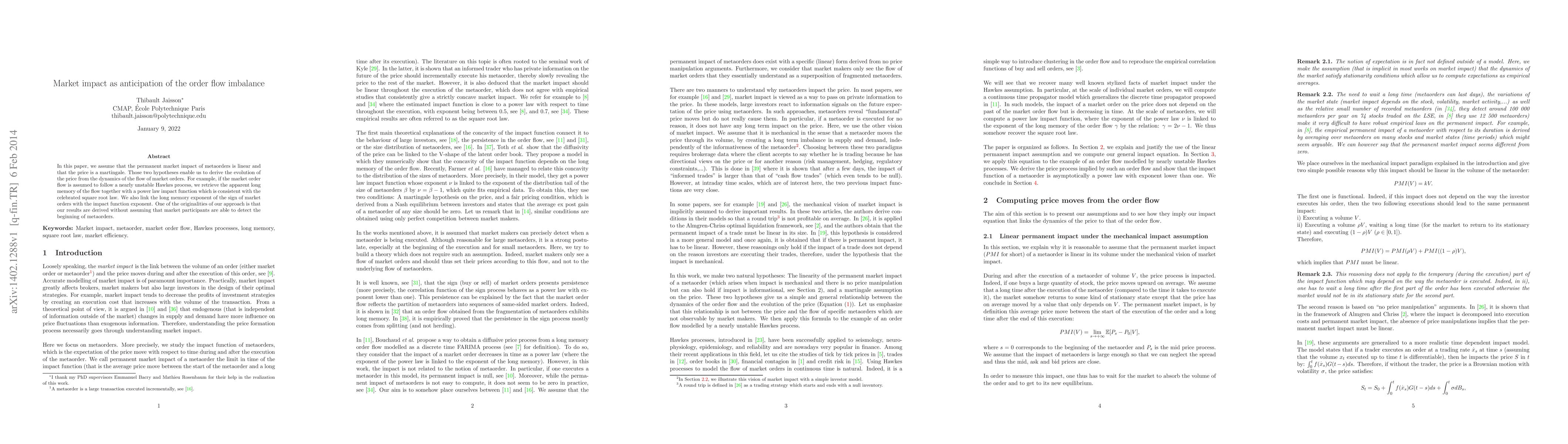 In this paper, we assume that the permanent market impact of metaorders is linear and that the price is a martingale. Those two hypotheses enable us to derive the evolution of the price from the dynamics of the flow of market orders. For example, if the market order flow is assumed to follow a nearly unstable Hawkes process, we retrieve the apparent long memory of the flow together with a power law impact function which is consistent with the celebrated square root law. We also link the long memory exponent of the sign of market orders with the impact function exponent. One of the originalities of our approach is that our results are derived without assuming that market participants are able to detect the beginning of metaorders.