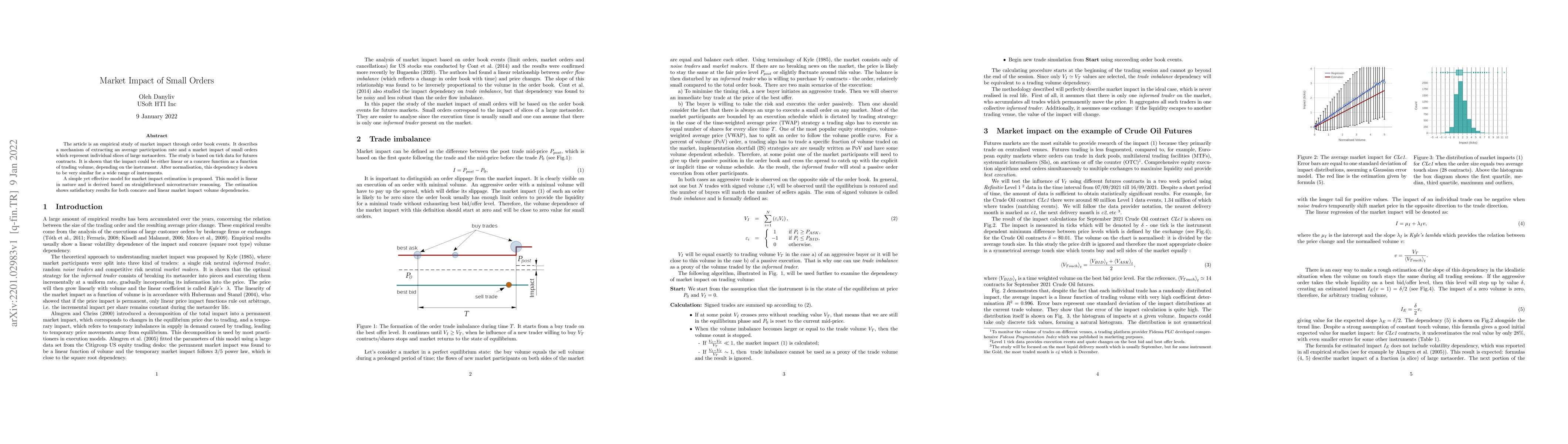 The article is an empirical study of market impact through order book events. It describes a mechanism of extracting an average participation rate and a market impact of small orders which represent individual slices of large metaorders. The study is based on tick data for futures contracts. It is shown that the impact could be either linear or a concave function as a function of trading volume, depending on the instrument. After normalisation, this dependency is shown to be very similar for a wide range of instruments. A simple yet effective model for market impact estimation is proposed. This model is linear in nature and is derived based on straightforward microstructure reasoning. The estimation shows satisfactory results for both concave and linear market impact volume dependencies.