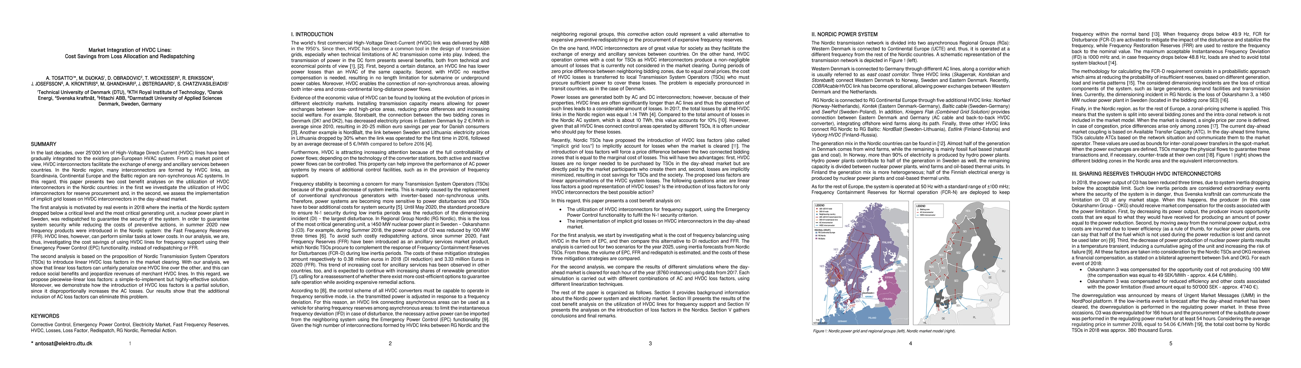 This paper examines cost benefits of HVDC interconnectors in the Nordic region, focusing on reserve procurement and loss allocation. It finds HVDC lines can provide frequency support at lower costs than traditional methods, and proposes piecewise-linear loss factors to fairly distribute HVDC losses, while also suggesting the inclusion of AC loss factors for optimal results.
