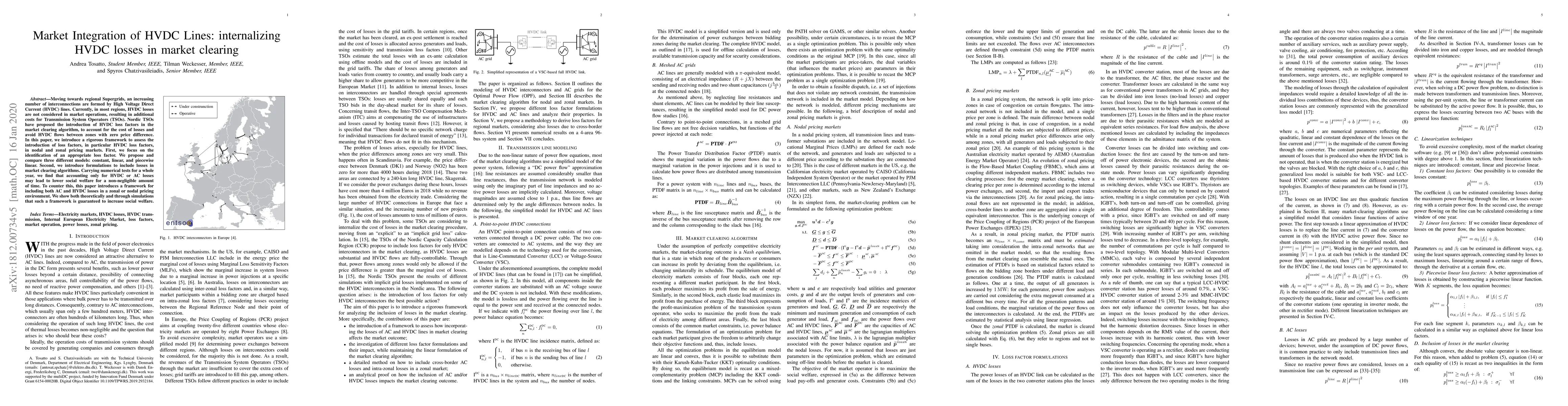 Moving towards regional Supergrids, an increasing number of interconnections are formed by High Voltage Direct Current (HVDC) lines. Currently, in most regions, HVDC losses are not considered in market operations, resulting in additional costs for Transmission System Operators (TSOs). Nordic TSOs have proposed the introduction of HVDC loss factors in the market clearing algorithm, to account for the cost of losses and avoid HVDC flows between zones with zero price difference. In this paper, we introduce a rigorous framework to assess the introduction of loss factors, in particular HVDC loss factors, in nodal and zonal pricing markets. First, we focus on the identification of an appropriate loss factor. We propose and compare three different models: constant, linear, and piecewise linear. Second, we introduce formulations to include losses in market clearing algorithms. Carrying numerical tests for a whole year, we find that accounting only for HVDC or AC losses may lead to lower social welfare for a non-negligible amount of time. To counter this, this paper introduces a framework for including both AC and HVDC losses in a zonal or nodal pricing environment. We show both theoretically and through simulations that such a framework is guaranteed to increase social welfare.