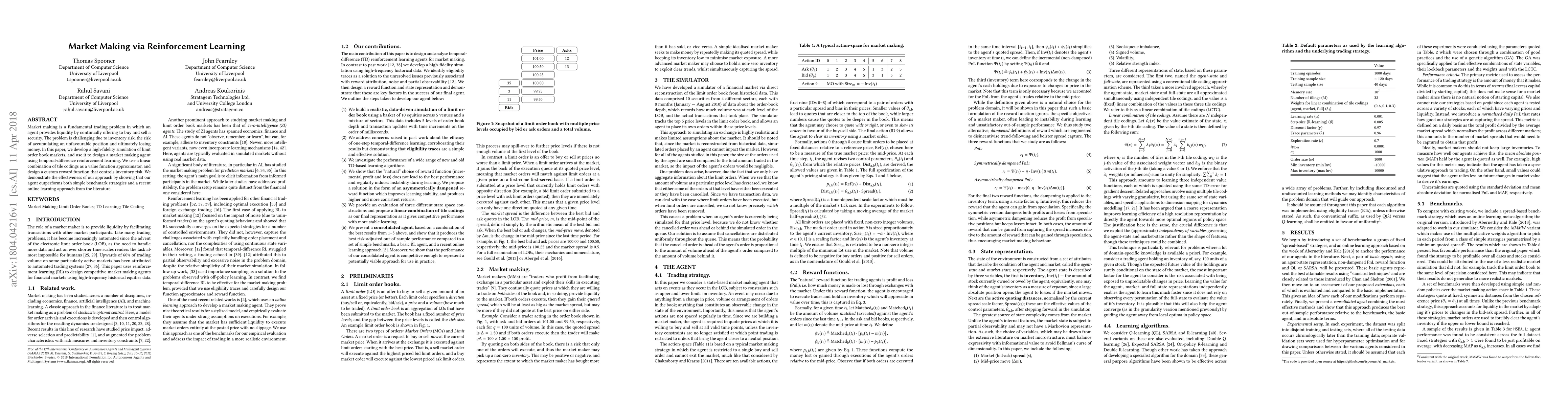 This paper develops a reinforcement learning-based market making agent using a high-fidelity limit order book simulation. The agent employs tile codings for value function approximation and a custom reward function to manage inventory risk, outperforming both simple benchmarks and recent online learning methods.