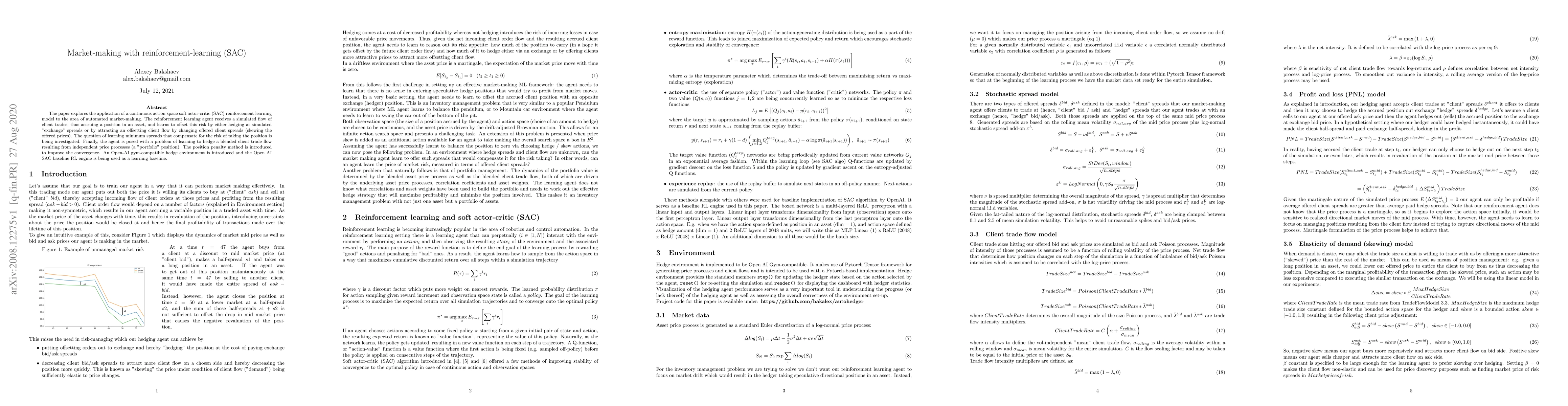 The paper explores the application of a continuous action space soft actor-critic (SAC) reinforcement learning model to the area of automated market-making. The reinforcement learning agent receives a simulated flow of client trades, thus accruing a position in an asset, and learns to offset this risk by either hedging at simulated "exchange" spreads or by attracting an offsetting client flow by changing offered client spreads (skewing the offered prices). The question of learning minimum spreads that compensate for the risk of taking the position is being investigated. Finally, the agent is posed with a problem of learning to hedge a blended client trade flow resulting from independent price processes (a "portfolio" position). The position penalty method is introduced to improve the convergence. An Open-AI gym-compatible hedge environment is introduced and the Open AI SAC baseline RL engine is being used as a learning baseline.