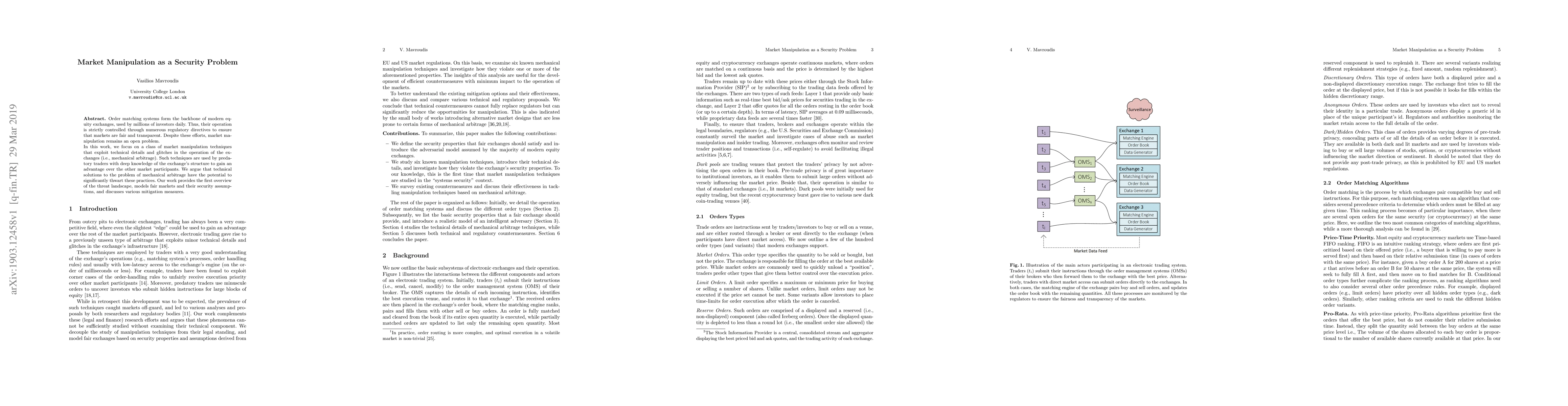 Order matching systems form the backbone of modern equity exchanges, used by millions of investors daily. Thus, their operation is strictly controlled through numerous regulatory directives to ensure that markets are fair and transparent. Despite these efforts, market manipulation remains an open problem. In this work, we focus on a class of market manipulation techniques that exploit technical details and glitches in the operation of the exchanges (i.e., mechanical arbitrage). Such techniques are used by predatory traders with deep knowledge of the exchange's structure to gain an advantage over the other market participants. We argue that technical solutions to the problem of mechanical arbitrage have the potential to significantly thwart these practices. Our work provides the first overview of the threat landscape, models fair markets and their security assumptions, and discusses various mitigation measures.