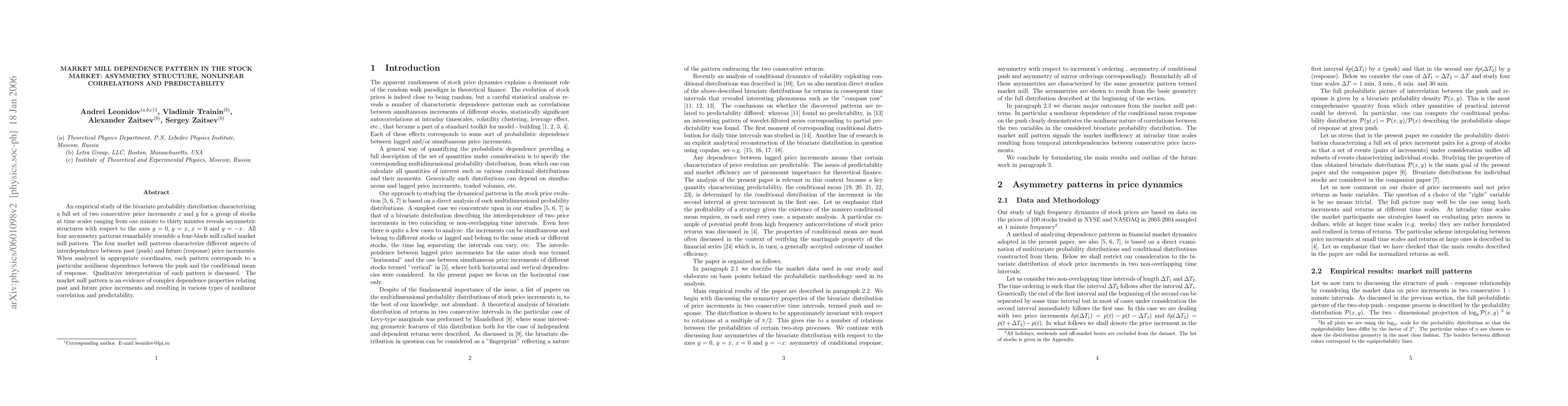 An empirical study of joint bivariate probability distribution of two consecutive price increments for a set of stocks at time scales ranging from one minute to thirty minutes reveals asymmetric structures with respect to the axes y=0, y=x, x=0 and y=-x. All four asymmetry patterns remarkably resemble a four-blade mill called market mill pattern. The four market mill patterns characterize different aspects of interdependence between past (push) and future (response) price increments. When analyzed in appropriate coordinates, each pattern corresponds to a particular nonlinear dependence between the push and conditional mean of response. Qualitative interpretation of each pattern is discussed. The market mill pattern is an evidence of complex dependence properties relating past and future price increments resulting in various types of nonlinear correlation and predictability.