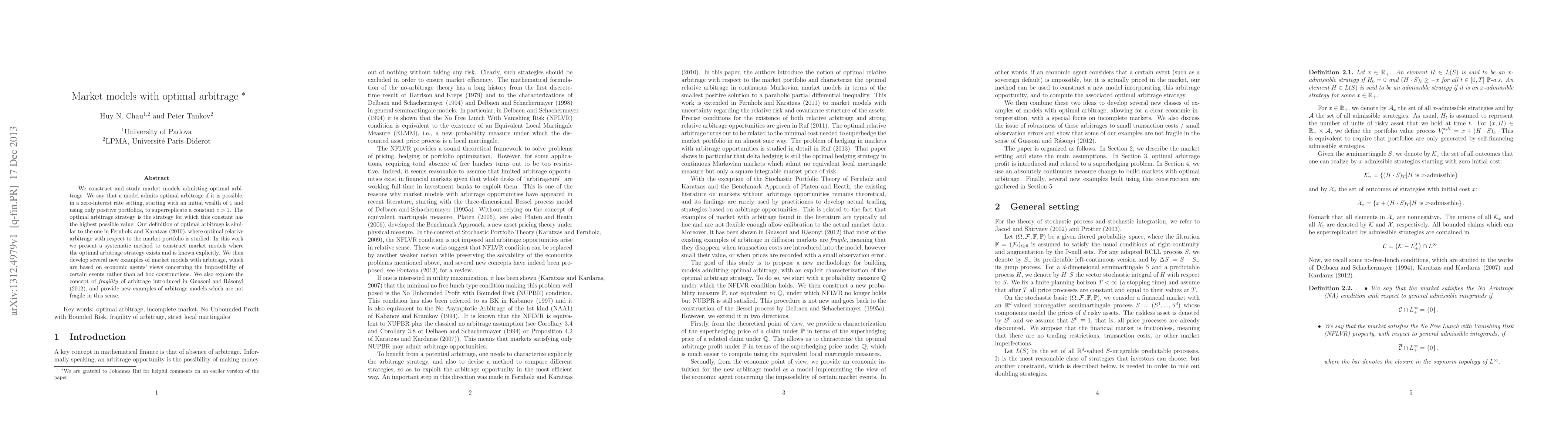 This paper constructs market models that allow for optimal arbitrage, where the highest possible superreplication constant can be achieved under zero-interest rates. It systematically develops these models based on economic agents' beliefs and explores the concept of arbitrage fragility, providing new examples of non-fragile arbitrage models.