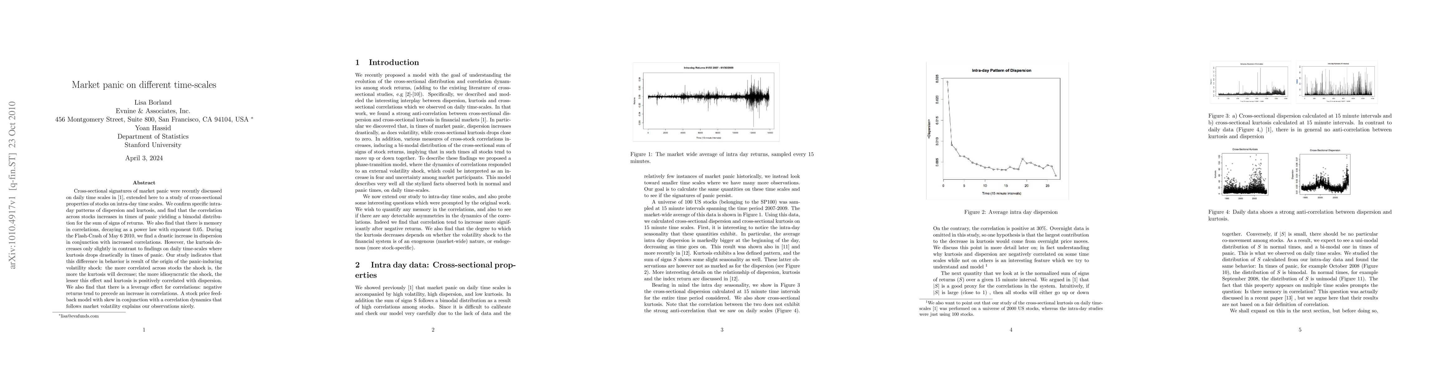 Cross-sectional signatures of market panic were recently discussed on daily time scales in [1], extended here to a study of cross-sectional properties of stocks on intra-day time scales. We confirm specific intra-day patterns of dispersion and kurtosis, and find that the correlation across stocks increases in times of panic yielding a bimodal distribution for the sum of signs of returns. We also find that there is memory in correlations, decaying as a power law with exponent 0.05. During the Flash-Crash of May 6 2010, we find a drastic increase in dispersion in conjunction with increased correlations. However, the kurtosis decreases only slightly in contrast to findings on daily time-scales where kurtosis drops drastically in times of panic. Our study indicates that this difference in behavior is result of the origin of the panic-inducing volatility shock: the more correlated across stocks the shock is, the more the kurtosis will decrease; the more idiosyncratic the shock, the lesser this effect and kurtosis is positively correlated with dispersion. We also find that there is a leverage effect for correlations: negative returns tend to precede an increase in correlations. A stock price feed-back model with skew in conjunction with a correlation dynamics that follows market volatility explains our observations nicely.