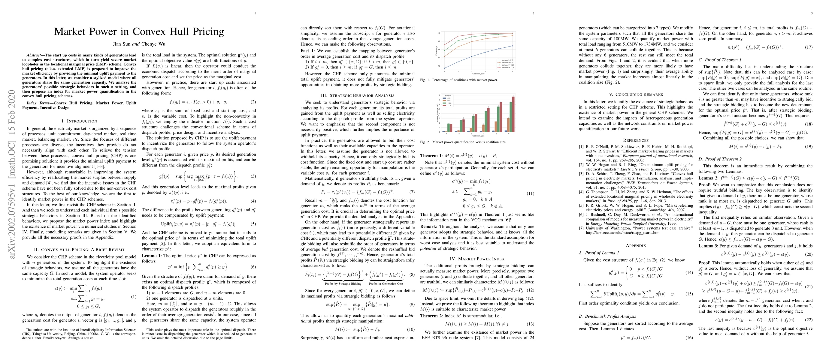 This paper explores the complex cost structures in generators that create market loopholes in the LMP scheme and proposes convex hull pricing to enhance market efficiency. It introduces an index to quantify market power under this new pricing model in a stylized scenario with uniform generator capacities.