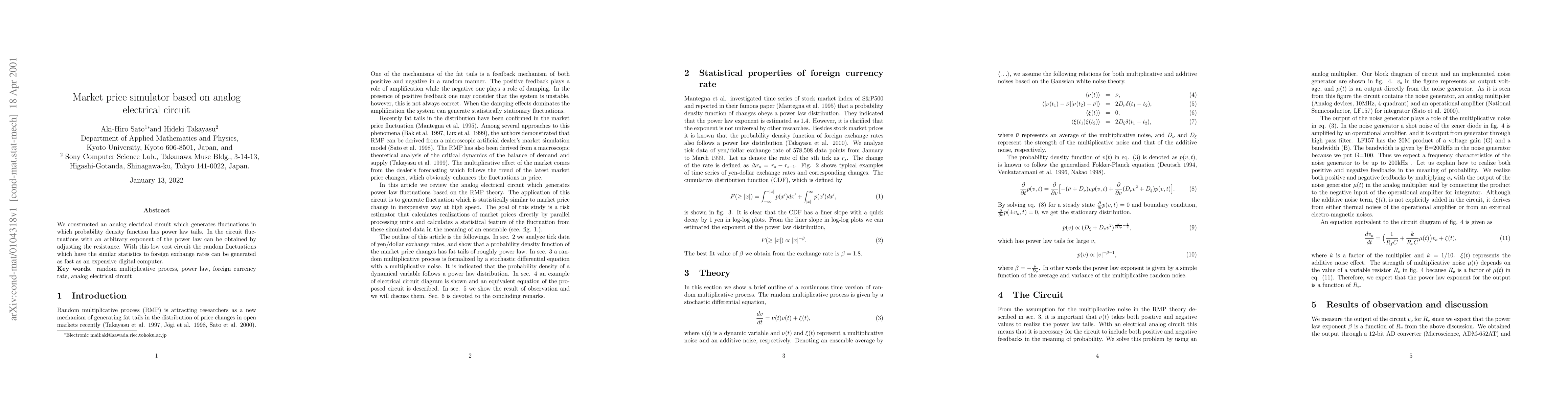 We constructed an analog electrical circuit which generates fluctuations in which probability density function has power law tails. In the circuit fluctuations with an arbitrary exponent of the power law can be obtained by adjusting the resistance. With this low cost circuit the random fluctuations which have the similar statistics to foreign exchang rates can be generated as fast as an expensive digital computer.