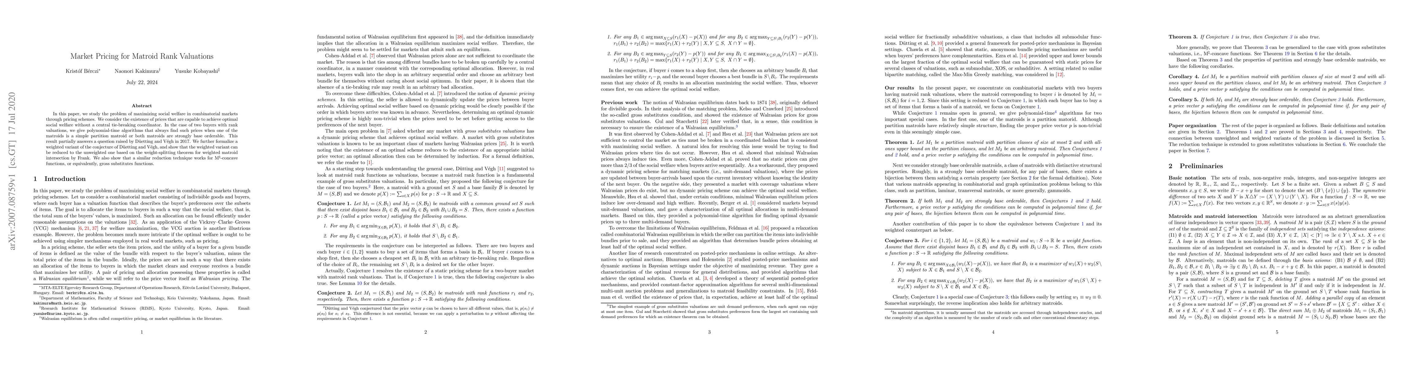 In this paper, we study the problem of maximizing social welfare in combinatorial markets through pricing schemes. We consider the existence of prices that are capable to achieve optimal social welfare without a central tie-breaking coordinator. In the case of two buyers with rank valuations, we give polynomial-time algorithms that always find such prices when one of the matroids is a simple partition matroid or both matroids are strongly base orderable. This result partially answers a question raised by D\"uetting and V\'egh in 2017. We further formalize a weighted variant of the conjecture of D\"uetting and V\'egh, and show that the weighted variant can be reduced to the unweighted one based on the weight-splitting theorem for weighted matroid intersection by Frank. We also show that a similar reduction technique works for M${}^\natural$-concave functions, or equivalently, gross substitutes functions.
